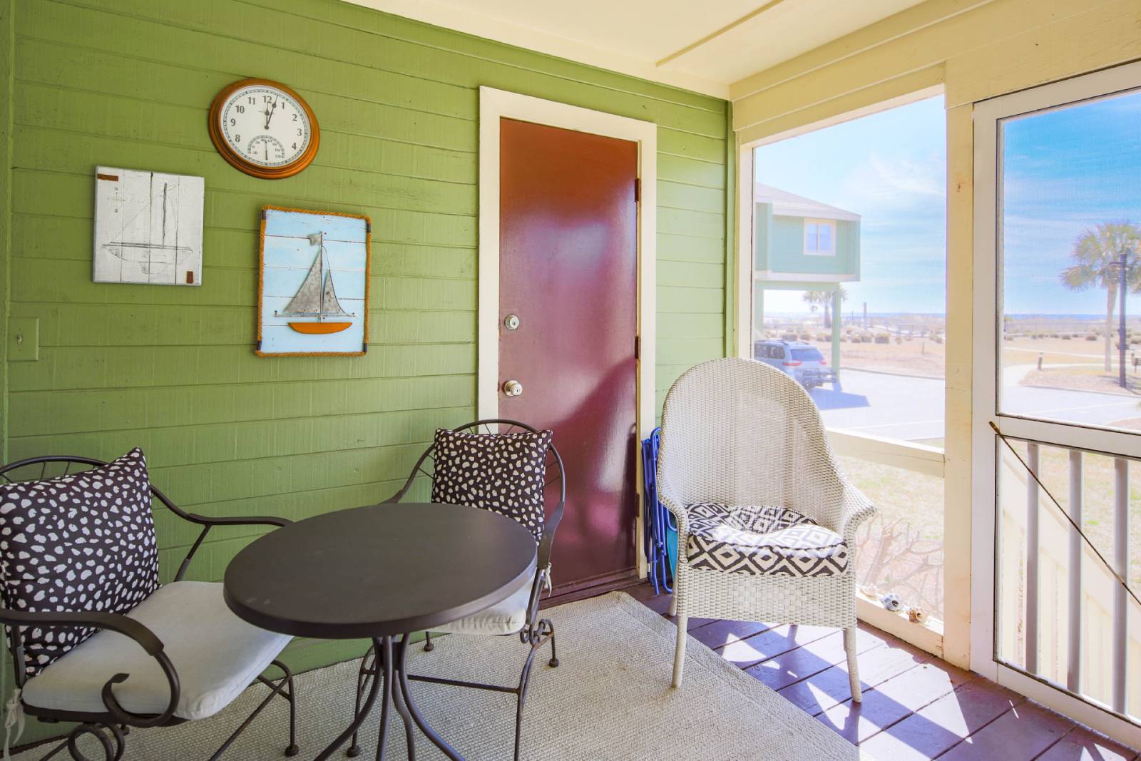 - Private screened balcony off the living room with outdoor seating, bistro table & chairs and an exterior door to reach the Mariners Walk community pool, grilling area, boardwalk & beach.