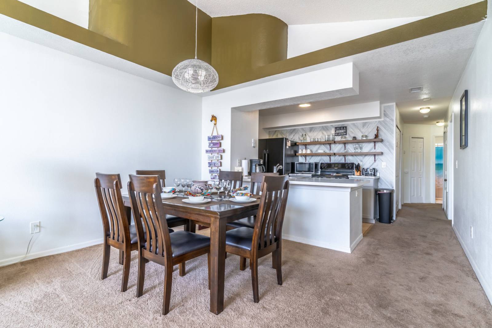 The open living area features cozy sofas (including a queen sleeper), a flat-screen TV, and vaulted ceilings for a bright, welcoming space. The dining area seats six, and the fully equipped kitchen with marble counters and modern appliances makes meal prep a breeze. Additional conveniences include a full-size washer and dryer and a high chair, ensuring a stress-free stay for your family.