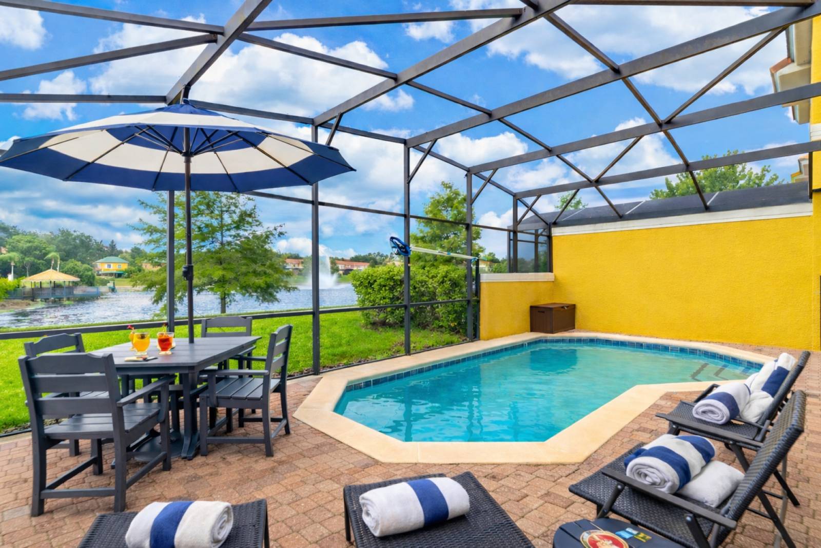 Professionally furnished and decorated, this spacious home features a bright open floor plan, a fully equipped kitchen, and a comfortable living/dining area that opens to your private screened-in pool with a tranquil lake view.