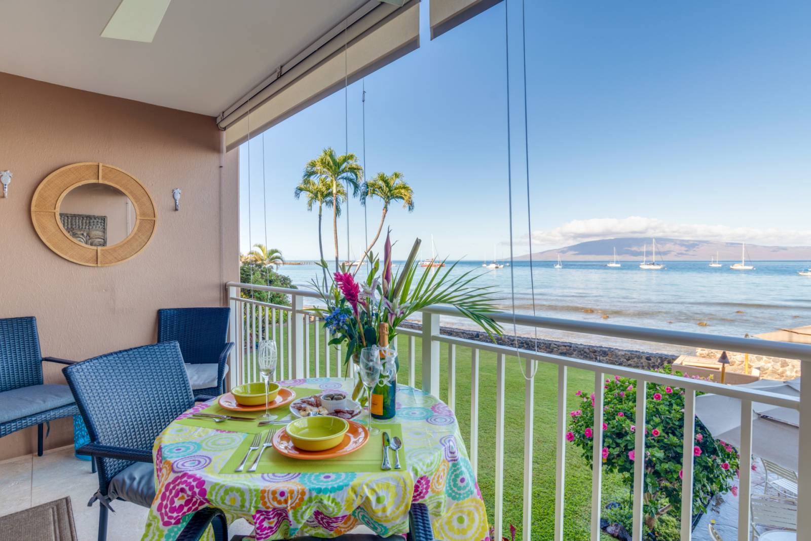 Enjoy pristine views of the beautiful blue Pacific and colorful Maui sunsets when staying at Lahaina Roads 205 - a direct oceanfront 1 bedroom, 1 bath updated and spacious condominium A fully equipped remodeled kitchen, full size appliances, and washer and dryer has all the conveniences of home. Your oceanfront lanai offer an intimate perspective of ocean and beach, especially for watching turtles, spinner dolphins, and humpback whales during the winter season.
