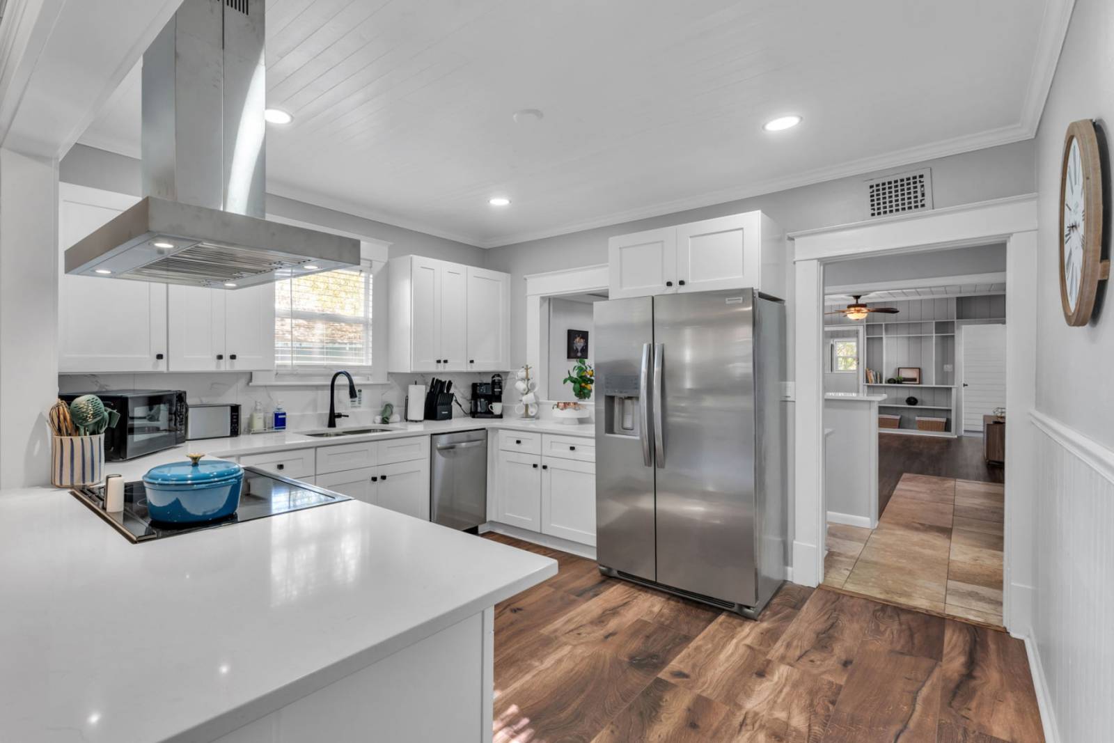 Each bedroom is thoughtfully furnished with fresh linens and ample storage, featuring three (3) king beds and one (1) queen bed. Bathrooms include a mix of a tub/shower combo, walk-in shower, and a convenient Jack-and-Jill layout, all stocked with starter essentials.
