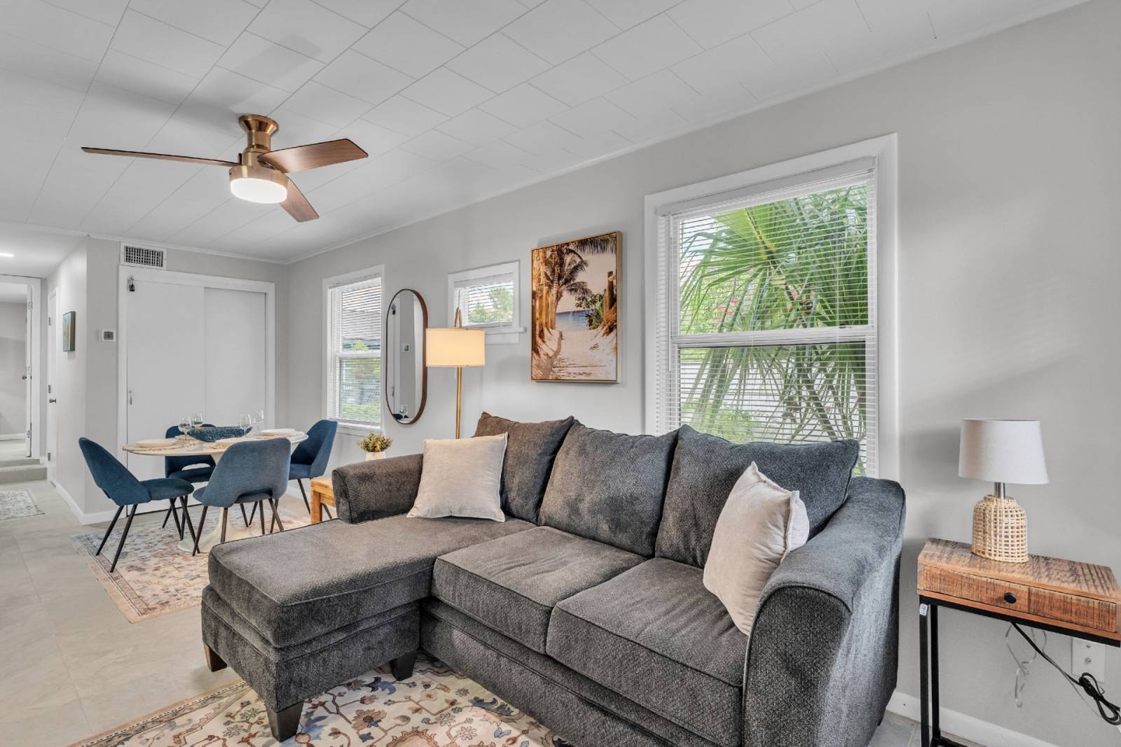 Inside, you'll find two comfortable bedrooms with plush bedding, a full bathroom plus an extra half bath for added convenience, Smart TVs, and a well-equipped kitchen for easy meals. Enjoy dining at the table for 4. Step outside to enjoy your morning coffee or evening drink in the private outdoor space—perfect for soaking in Florida’s sunshine at the outdoor dining table.