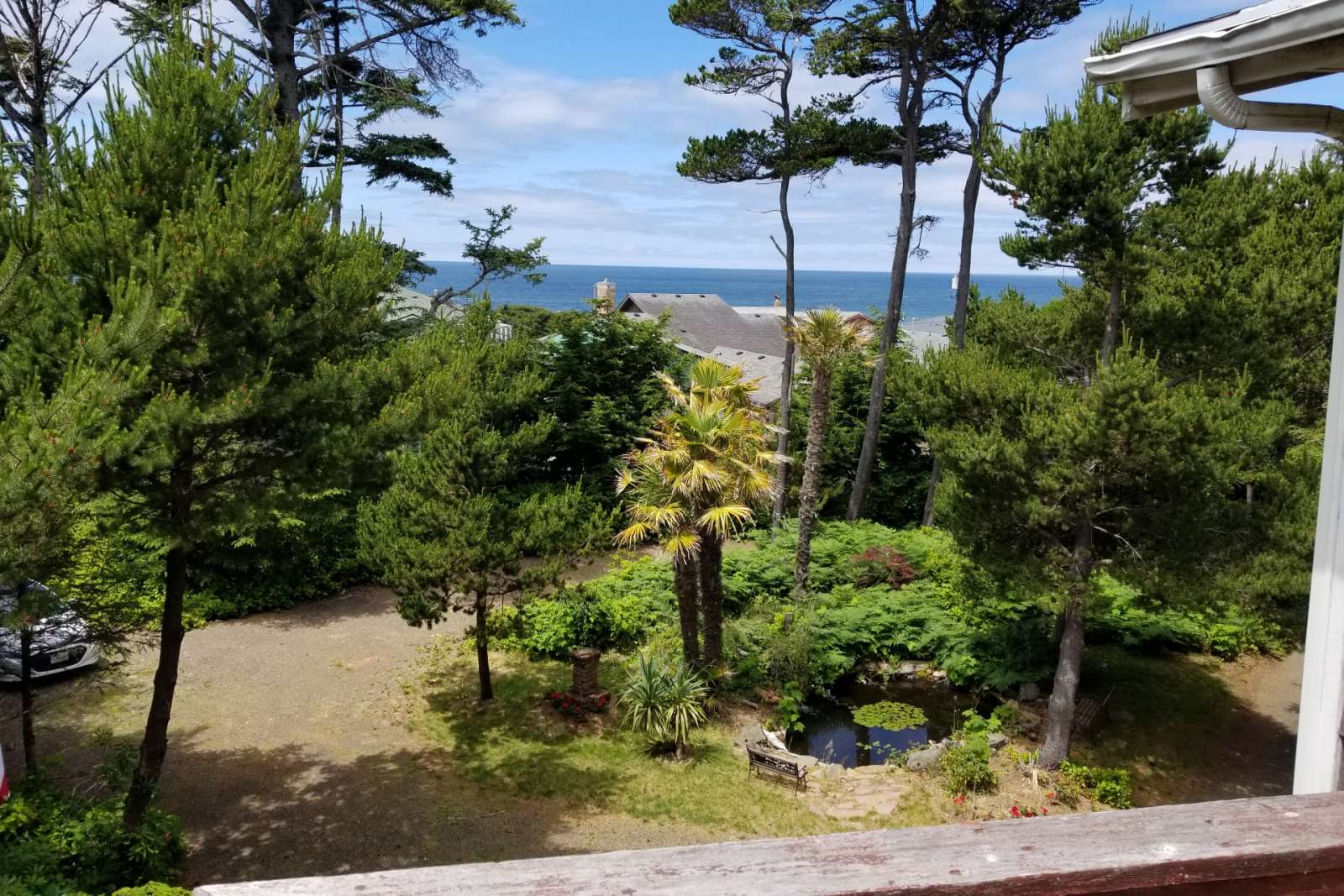 Large deck with views of the pond, gardens, and distant ocean