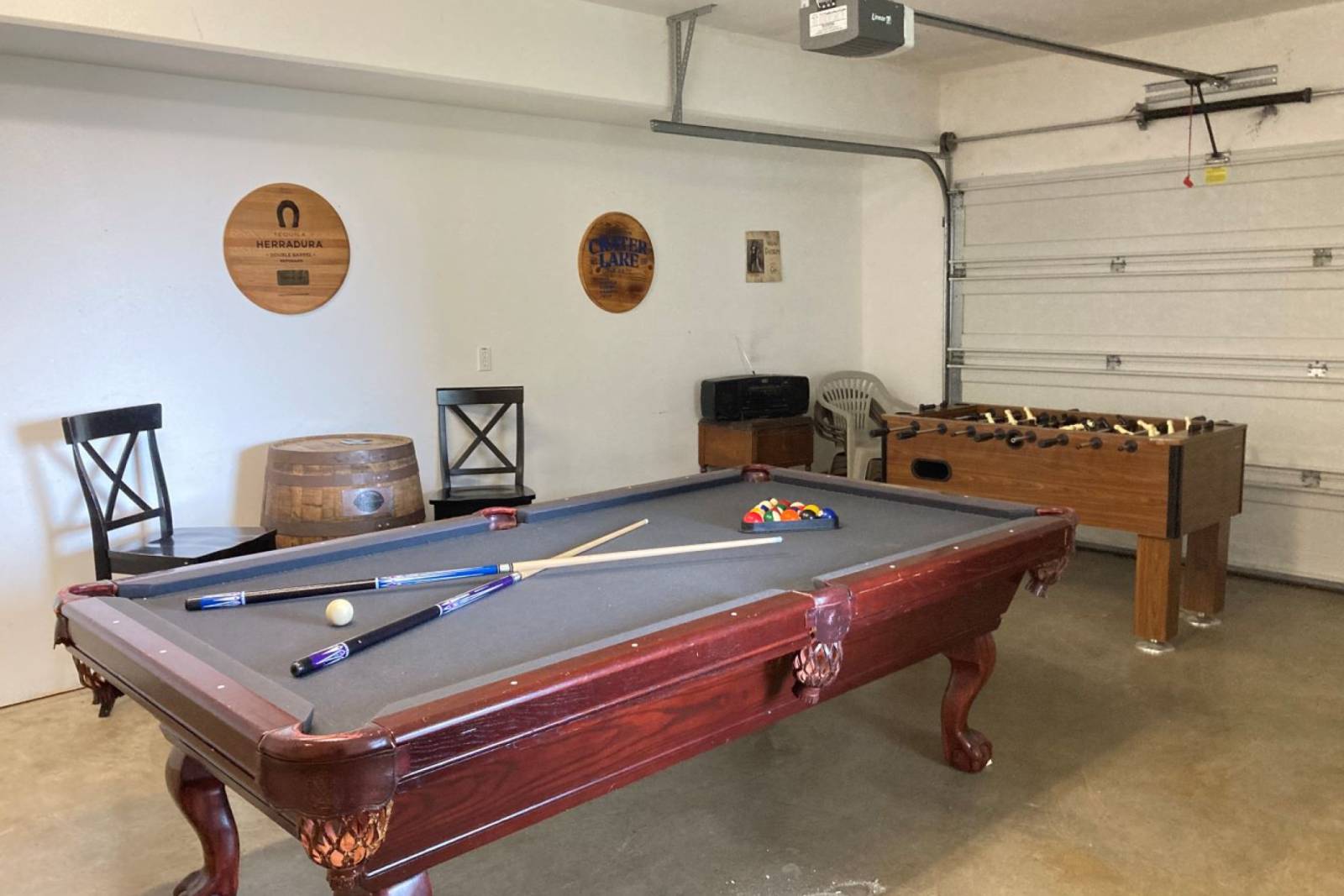 Head out to the garage for some friendly competition where you’ll find a pool table and foosball table, making it easy to keep everyone entertained no matter the weather.