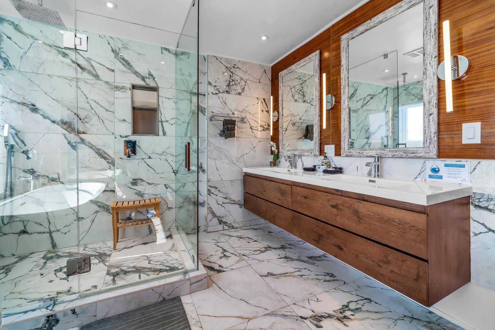 Primary Master Suite w private balcony - Cal King Bed 65" SmartTV. Ceiling fan. Renovated spa-like ensuite bathroom, with separate soak in tub, double vanity sinks and large walk-in shower.