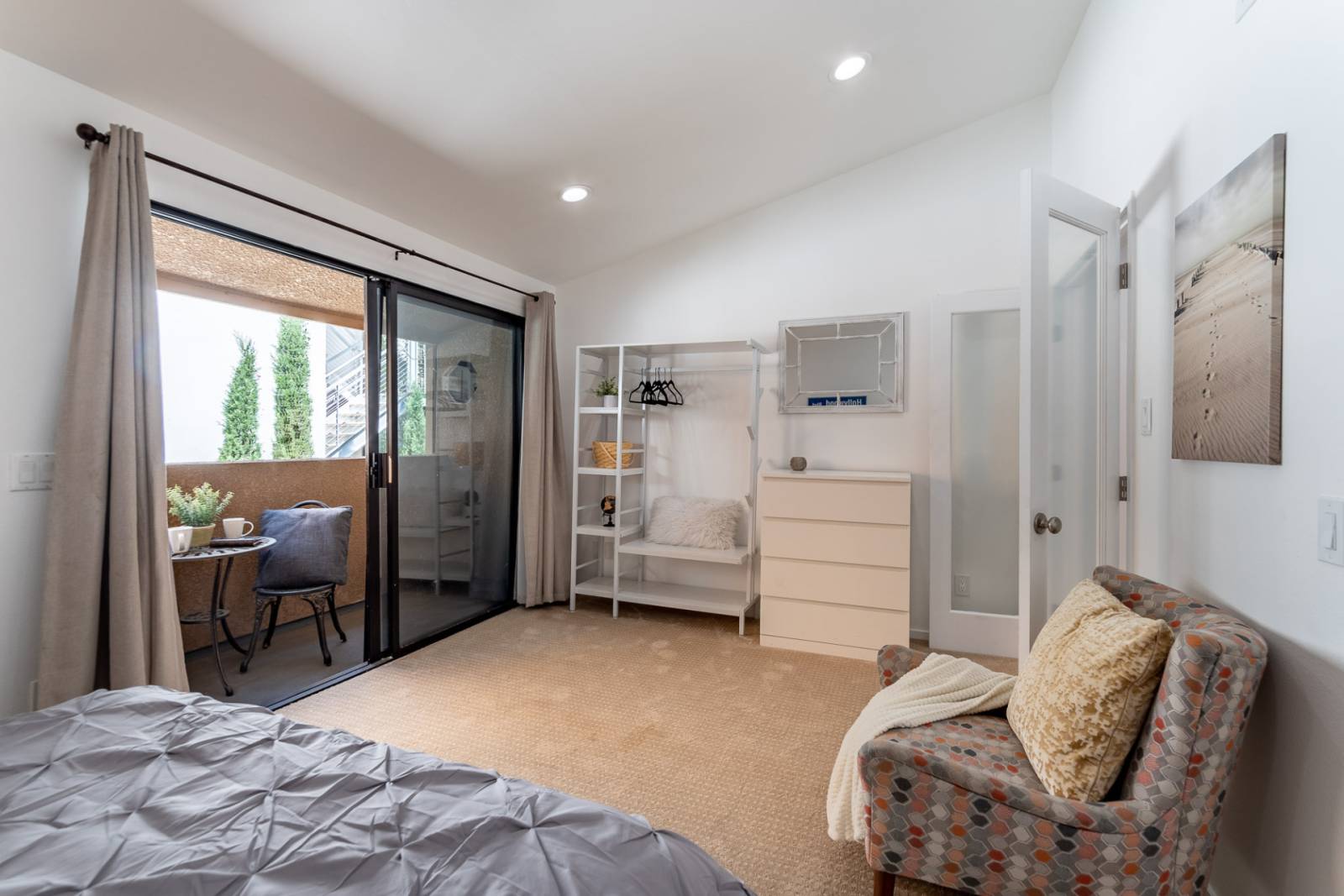 Primary Bedroom with Memory Foam Queen Size bed and private quiet balcony access. Converted large walk-in closet into a private office space for those Zoom calls or great meditation space.