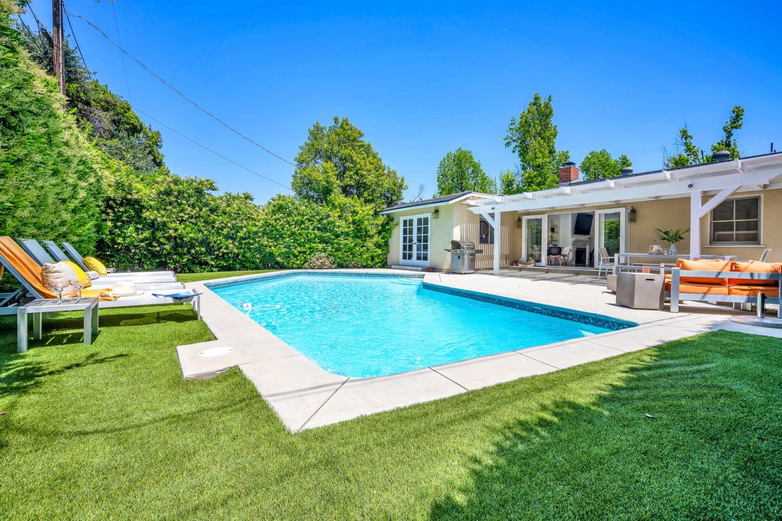 Escape to your own gorgeous private pool oasis in a peaceful neighborhood on a tree-lined street. Welcome to Sophia's Oasis and enjoy a stylish experience in this remodeled home with a fabulous open floor plan, spacious private bedrooms, remodeled kitchen and bathrooms. The primary bedroom has its own en-suite private bathroom and pool side views of the lush backyard. The back yard feels like you are in Palms Springs! The pool has been completely remodeled. Beautiful citrus trees in the front yard - plus your family dog welcome too!