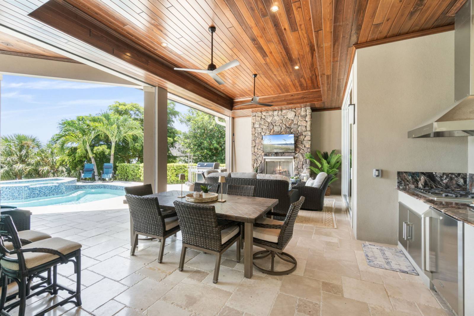 - Covered lanai with lounge and dining furniture, flat screen TV