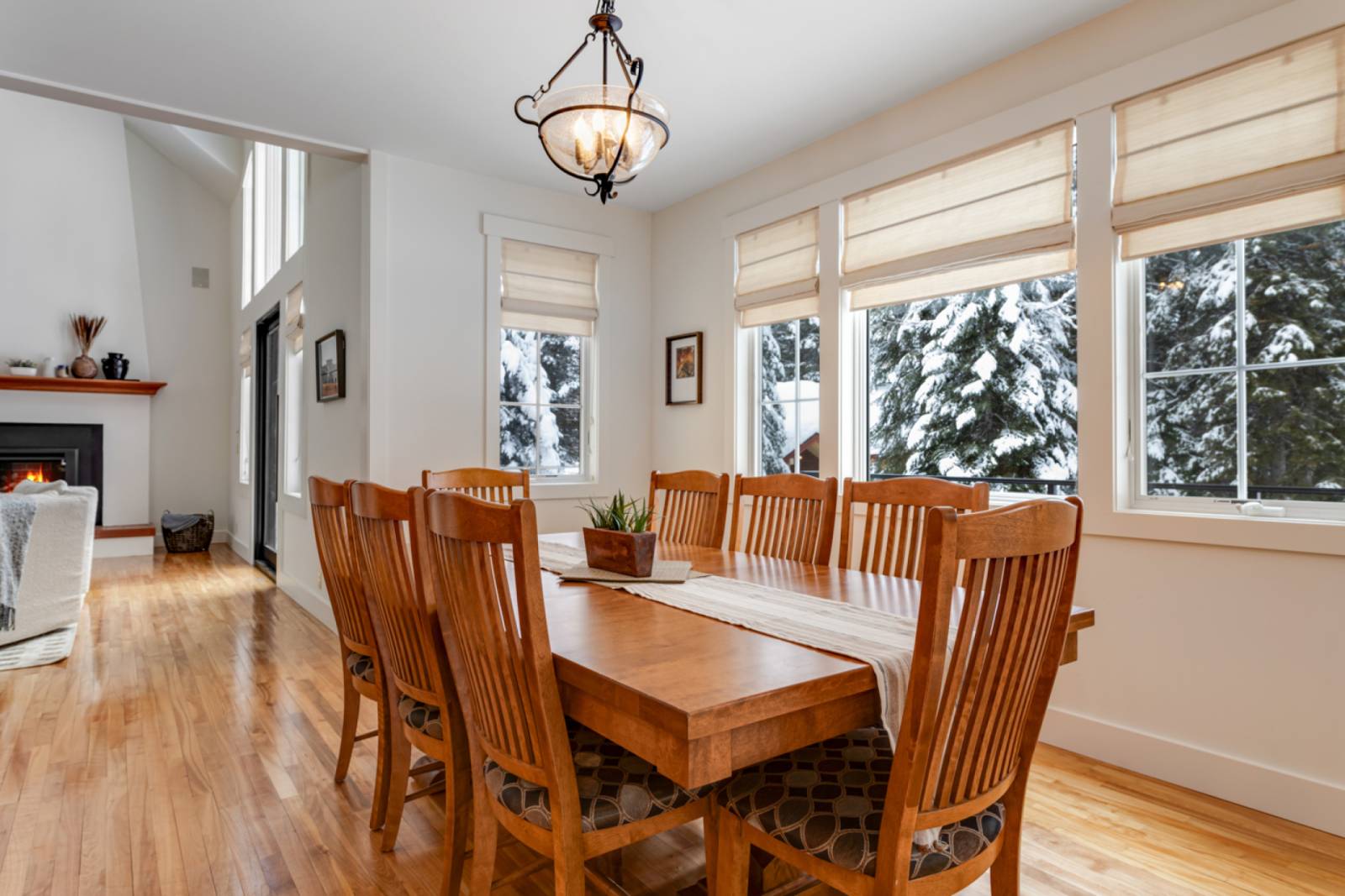 The gourmet kitchen, fully equipped with modern appliances and adorned with granite countertops, invites culinary adventures. Share delightful meals in the elegant dining area (dining table seats 8 & kitchen island seats 4) or take the feast outdoors to the expansive deck where you can dine al fresco amid the crisp mountain air.