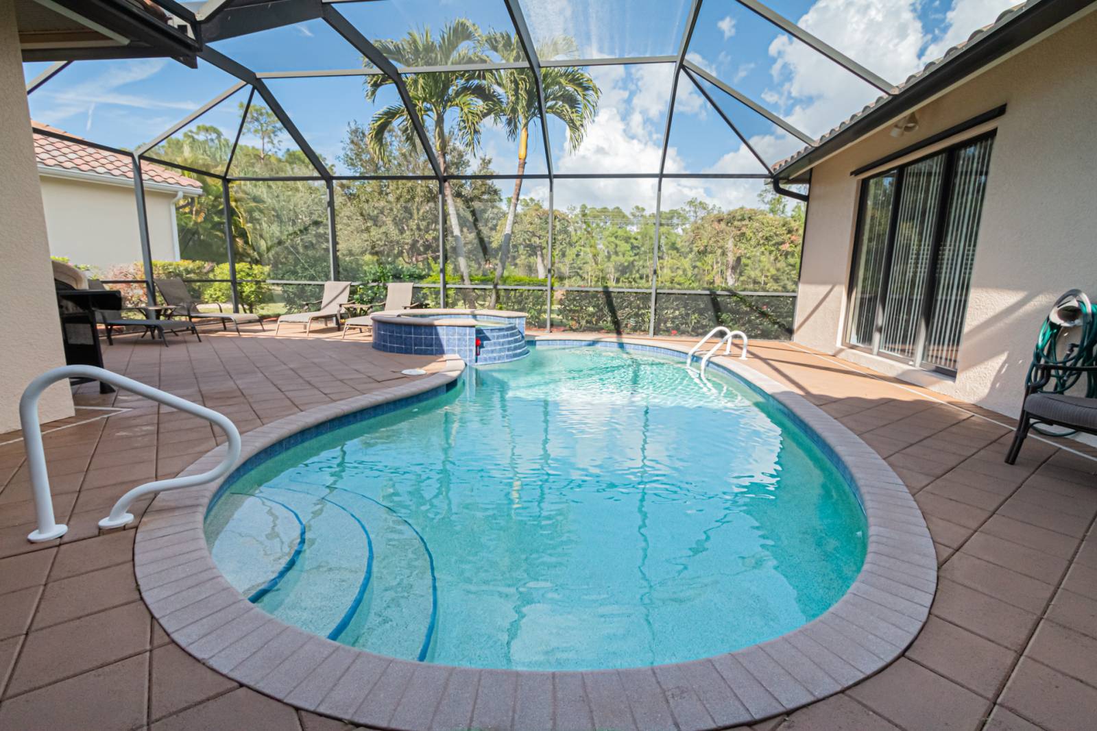 Outdoor screened pool cage w/fantastic lanai space for sun lounging. Covered lanai w/6 seat patio table for outdoor dining. Enjoy the gas BBQ grill for outdoor culinary endeavors while overlooking refreshing pool/spa and incredible lake views.