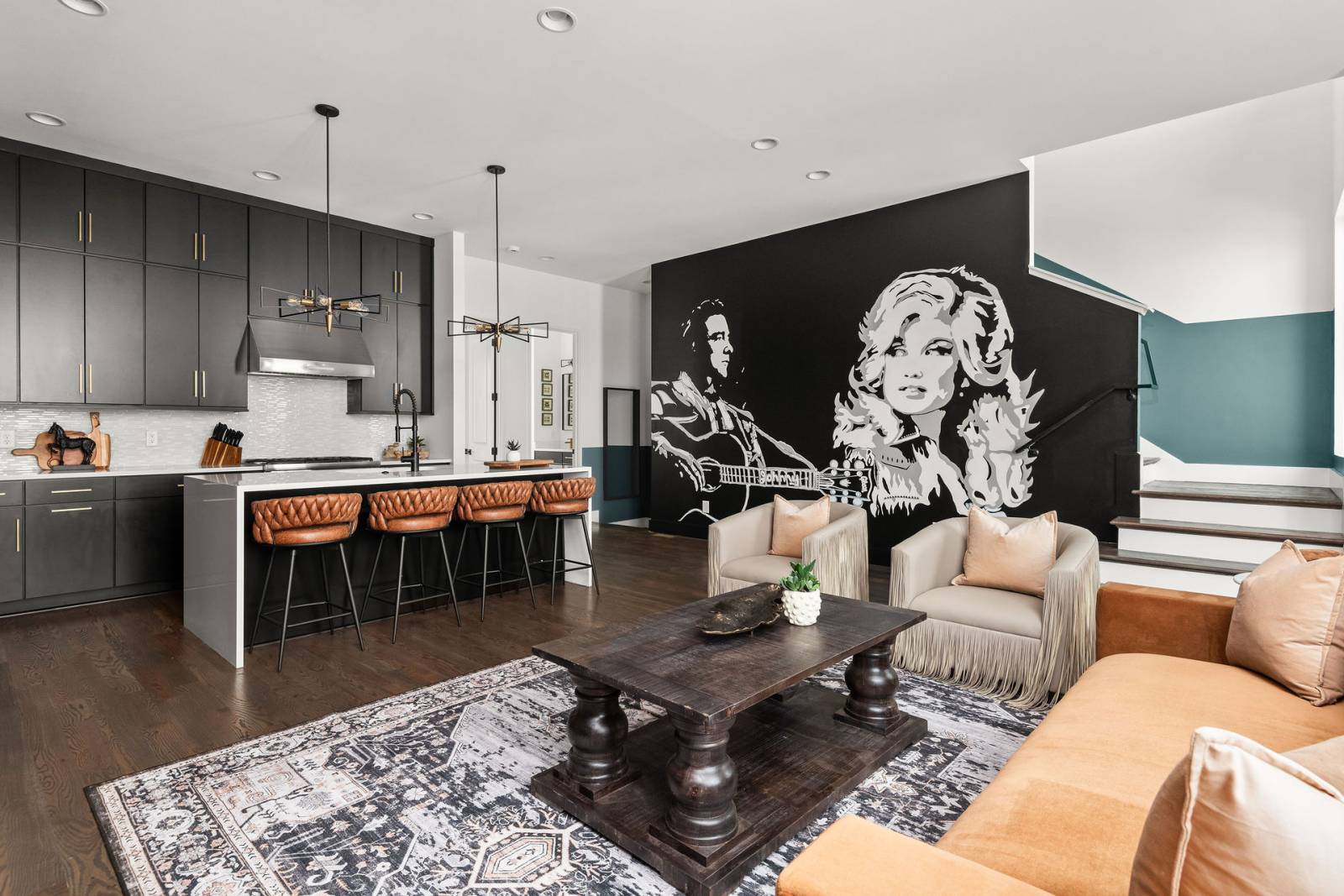 ✓ Bold Design: Fun, fearless decor—yes, that is Dolly and Johnny keeping watch.