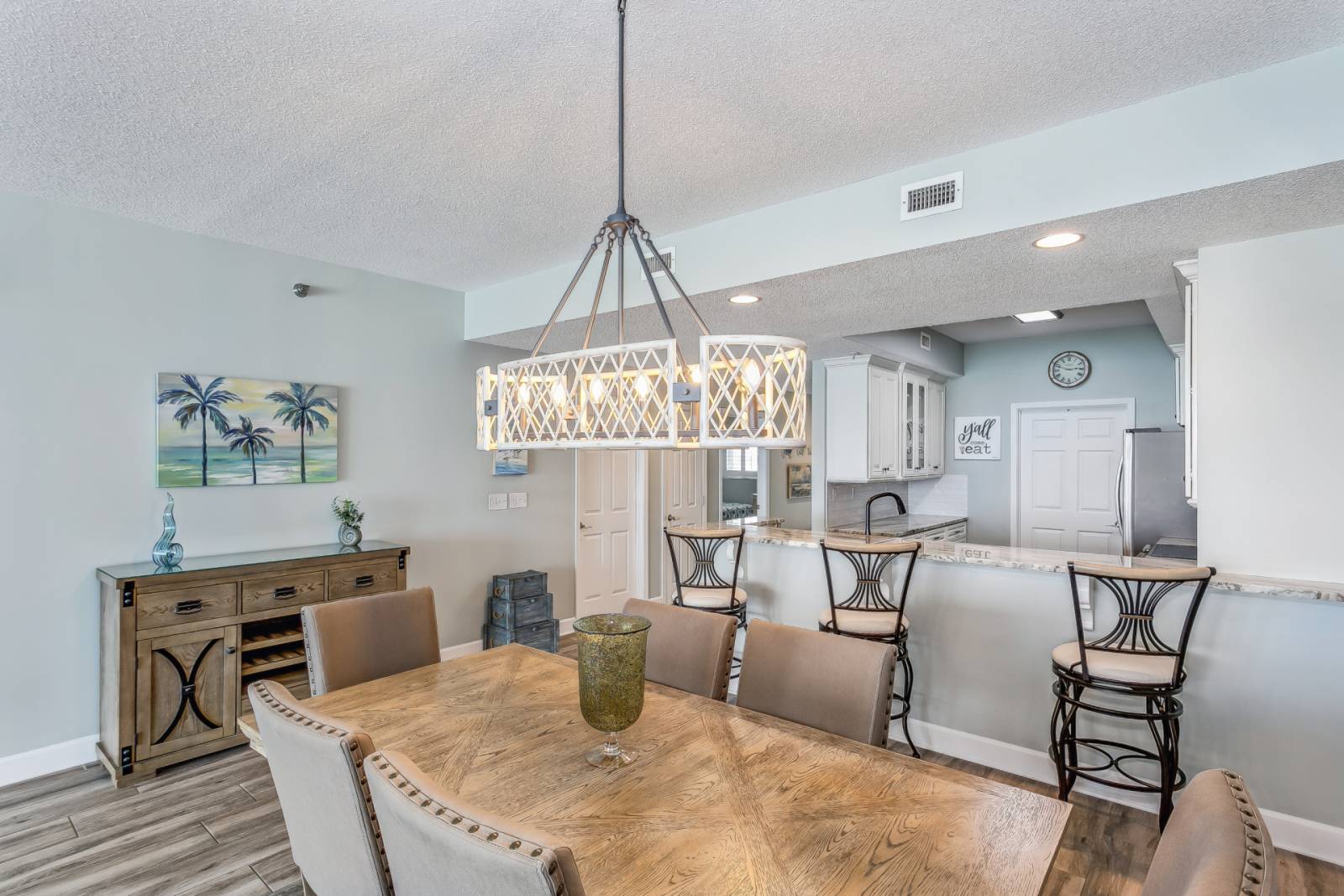 The moment you walk in you'll notice the huge floor to ceiling glass sliding doors that give way to amazing views of the Gulf of Mexico. The cozy living room features a large flat screen smart TV and a reclining leather couch. It is connected to the open dining area with seating for 6. There is also additional bar seating for 3 leading in to the clean, modern, fully equipped kitchen. The attached, oversized laundry room features a full size washer and dryer stack unit, extra cabinet storage, and a deep freezer.