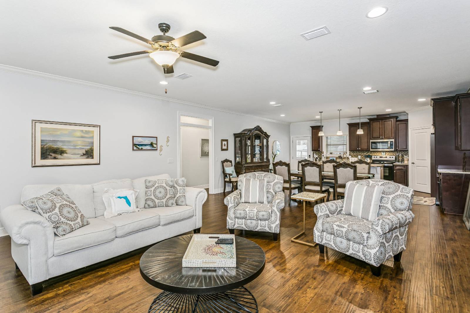 With over 2000 square feet and 4 large bedrooms this home can easily accommodate 8 guests. Walk straight into the large open living room with high end furniture and large smart TV. There are hardwood floors throughout leading to the gorgeous dining table and gourmet kitchen. You'll immediately feel right at home with the comfortable furnishings and decor. The home is conveniently laid out with the primary suite on one side and the other three bedrooms on the other. The three queen bedrooms share the hall bathroom that is completely updated with a shower/tub combo. The primary suite features an extremely comfortable king bed, smart TV and recliner. The en suite is gorgeous with a granite double vanity and custom tile walk-in shower. There is a laundry closet with full size washer and dryer just outside the primary suite.