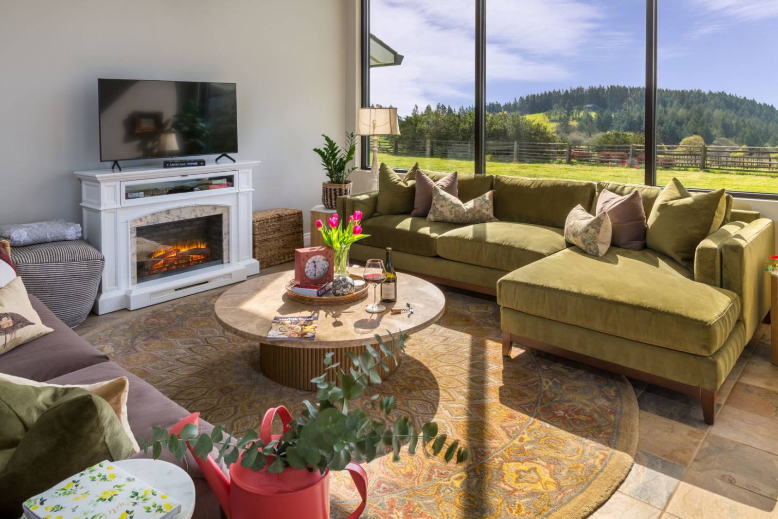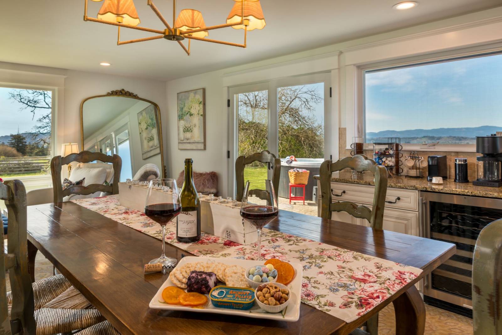 Brand new furniture paired with luxury vintage finds fills this spacious, charming new vacation home. The main living space located directly off the kitchen features a cozy couch, comfy chairs, an electric fireplace, large smart TV with Netflix and other streaming services. Large picturesque windows bring the outdoors in with stunning vineyard views which you and your guests will love!
