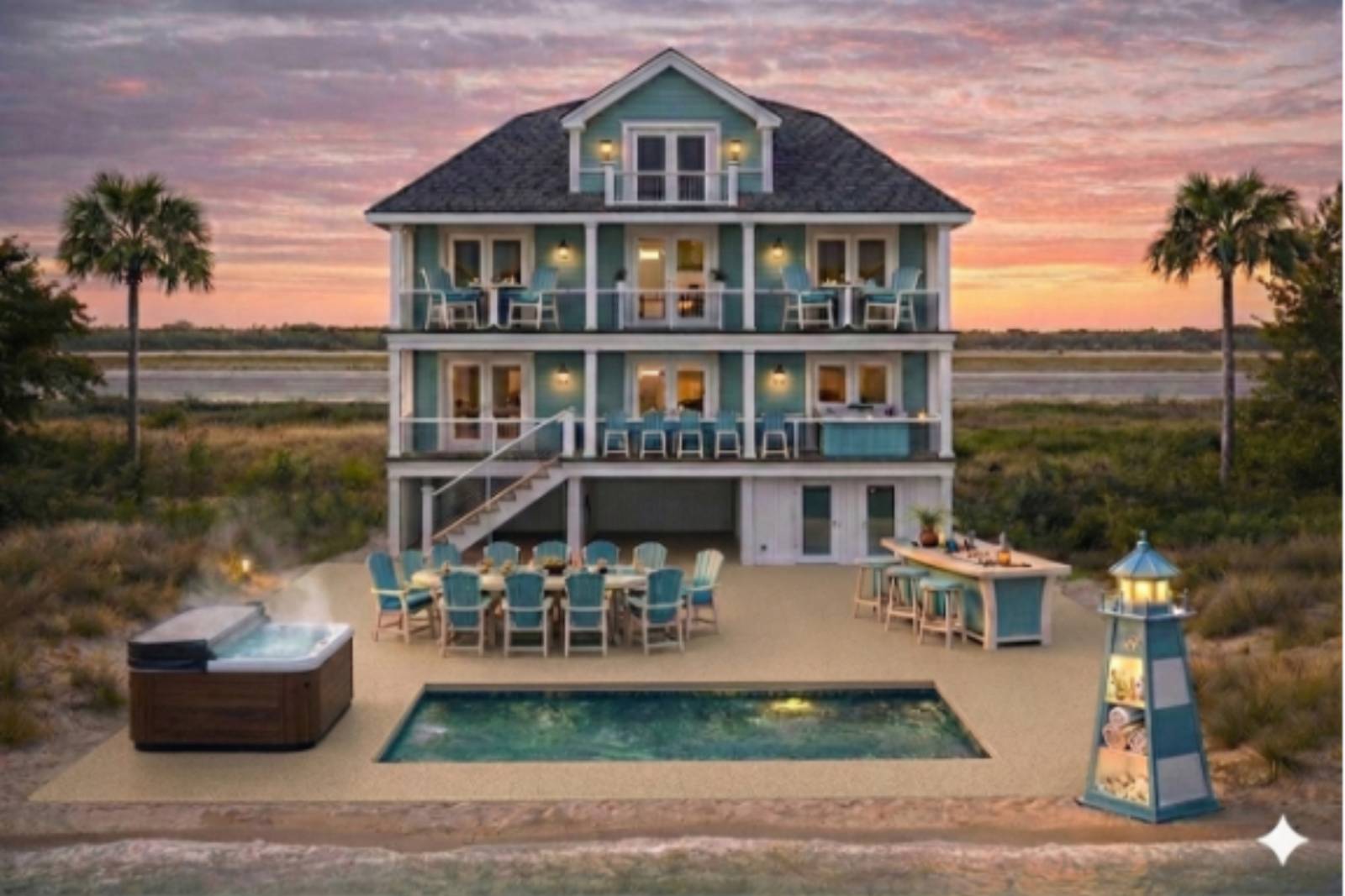 Step outside and you’ll find your own slice of paradise: A private pool and hot tub, plenty of space to lounge, and direct beach access just steps from your door. Inside, the amenities keep coming—an elevator for easy access to all levels, a game room for endless entertainment, and a private gym so you can keep up with your routine (or pretend you will).