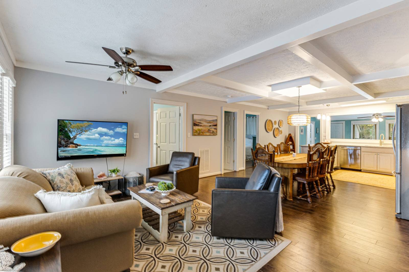 Enter the Front Door to an Open Concept Living Area, Dining Table & Kitchen. Just Beyond the Kitchen is a Secondary Living Area (TV/Toys). All TVs are Smart TVs on which you can Stream your Favorite Shows. In the Front Living Area is a Comfortable Sectional Sofa, TV & DVD Player, Coffee Table for Playing Games/Assembling Puzzles. The Dining Table Seats 8; Kitchen Bar Seats 2 & the Pass-Through to the Kitchen from the Back Living Area Seats 2. The Kitchen is Stocked with Everything you need to Create Delicious Meals. Small Appliances include Drip Coffee Maker, Electric Hot Water Pot, Blender, 2 Slice Toaster, Food Processor, Hand Mixer & Electric Can Opener. Next to the Stove is a Revolving Rack with all the Most Commonly Used Spices. Add a little Char to that Dinner Flavor using the Propane Grill. Dine Alfresco at the 2 Picnic Tables in the Backyard. Step down into the Secondary Living Area with Lots of Natural Light Shining in through the Many Windows Overlooking the Back. Plenty of Open Floor Space for Kids to Play. There are 2 Leather Chairs & Sofa to Relax while Watching TV.