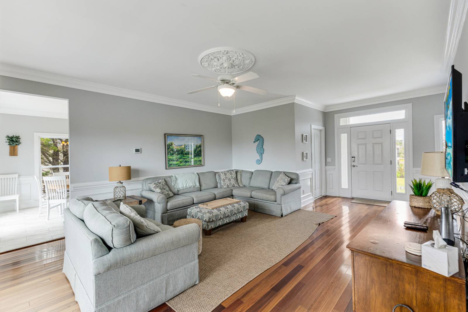 On the main level, there is a living area with comfortable seating, a smart TV & a variety of games & beach reads. The half bath is just off the living area. Gather for meals at the dining table & the kitchen bar. The fully stocked kitchen has 2 coffee pots. Brew a pot of regular & decaf & for those in between pick-me-ups, brew a k-cup of your favorite hot beverage. Lots of glasses for those margaritas & glasses of wine enjoyed on the porches.