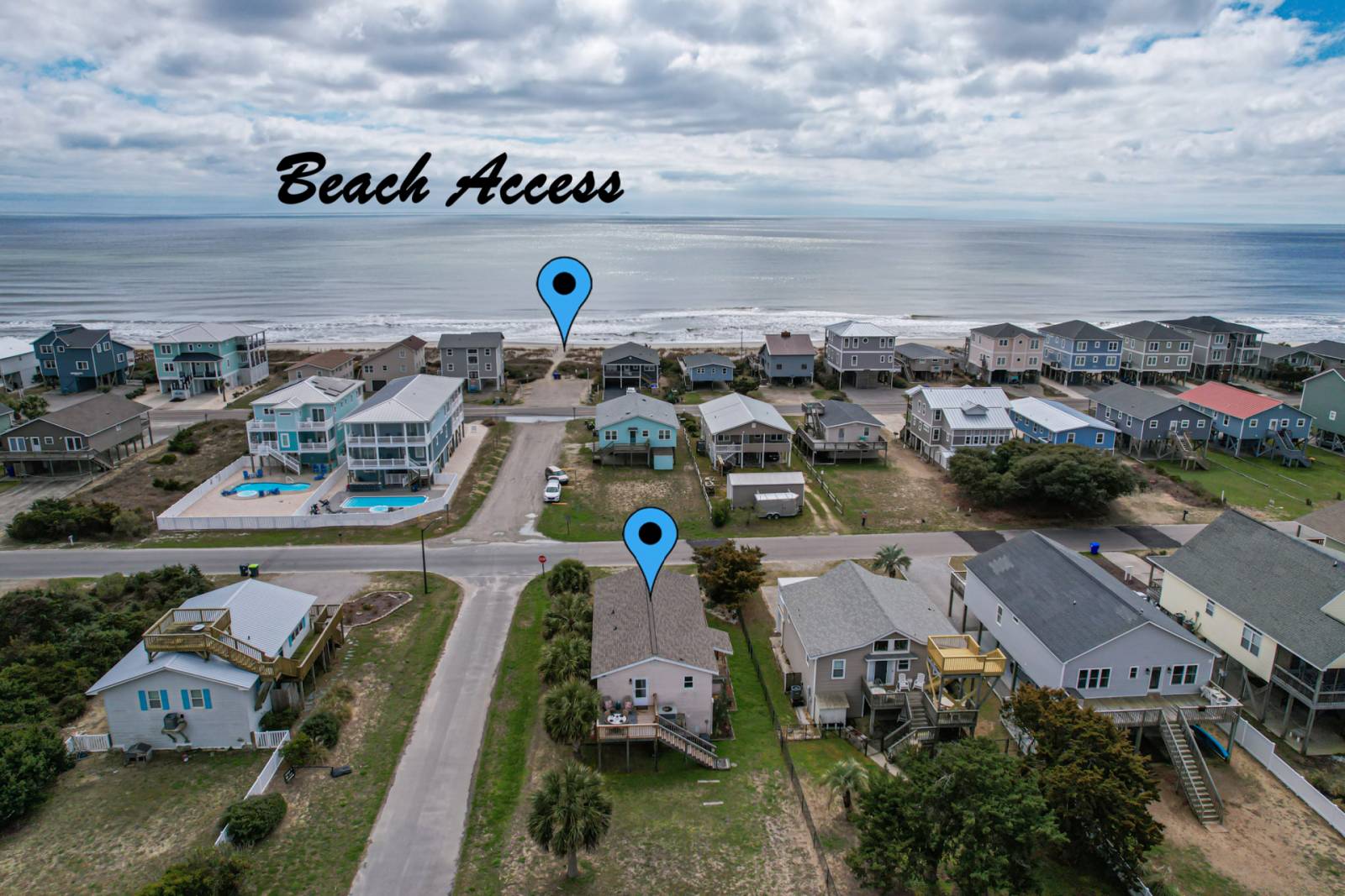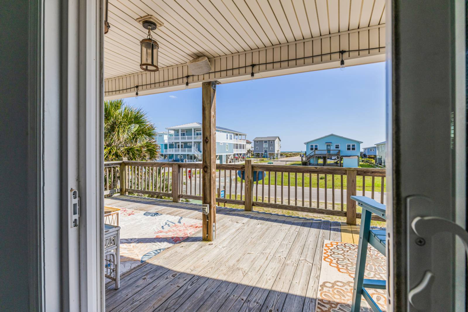 This 3 bedroom home on 1 level (up one flight of stairs), sleeps 8. Its open floor plan is perfect for family vacations. You enter the open concept living/dining/kitchen areas with the long continuous vertical grooves of the light sky blue plank ceilings, the windows flanking the west side & the sliding glass doors which create that coastal airiness that is so inviting. It is flooded with natural light & you can see the ocean (only 1 block away), before you ever put on your swimsuit. In the living area get comfortable on the sofa or 1 of the 2 upholstered chairs. Stream a movie, just add popcorn! The large coffee table is well suited to the wide variety of family friendly games to play or puzzles to be assembled. Perhaps you want to go on the front or back deck with your morning coffee & get lost in one of the several genres of beach reads to choose from. The dining table seats 8 & the kitchen bar seats 3. The kitchen is fully stocked including a Gas Stove, Drip Coffee Maker, Hot Water Pot, Blender, Immersion Blender, Mandolin, Hand Mixer, Indoor Tabletop S’more Maker & Stock Pot to make the low country seafood boils our coast is known for. There are 2 Seafood Boil Companies on the island where you can choose what seafood you want & they even include the seasonings & simple directions. Everything you need to create a memorable beach vacation meal. Whether caught or bought, put that fish on the charcoal grill downstairs for a little extra flavor. The front deck has an ocean view with large sectional seating. The back deck’s view is towards the marsh & the Davis Canal. There are 2 Adirondack chairs & a table seating 4 for alfresco dining.