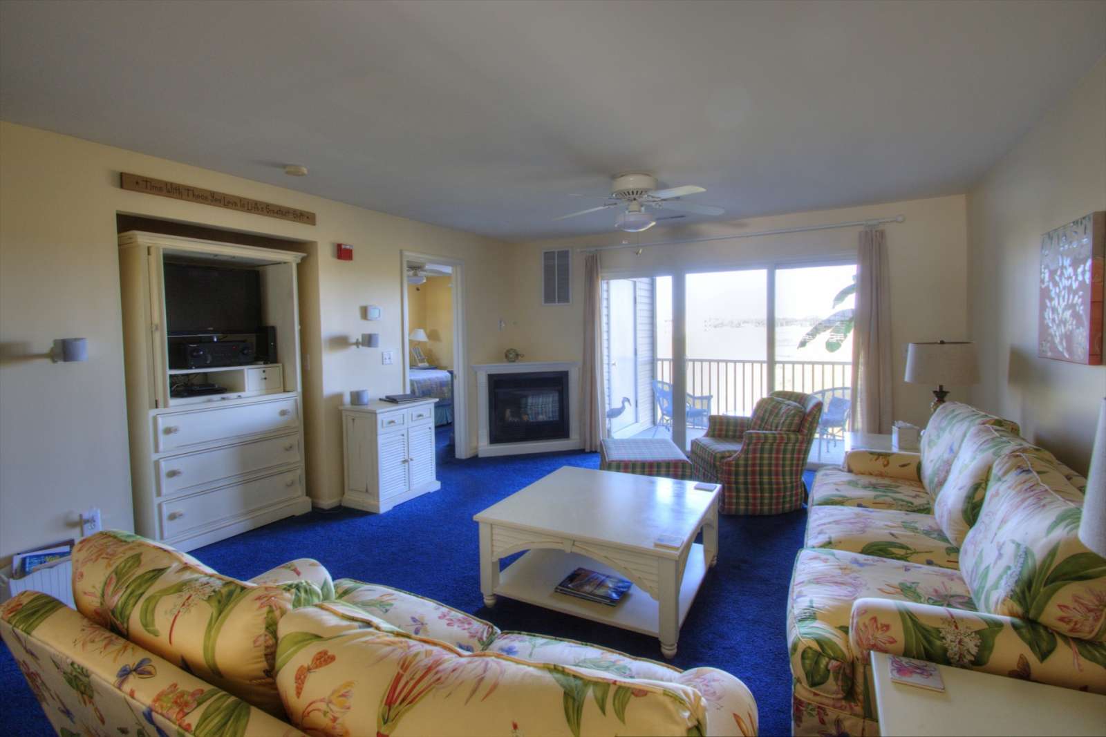When you're not outdoors, relax on the screened-in porch with your favorite drink and enjoy watching the wildlife and sunsets. You can eat inside at the table for four in the kitchen or enjoy the spacious living room. There are three TVs, living room, and both bedrooms. WiFi, cable TV, and stereo surround sound. A kitchen that is up-to-date and stocked with plenty to enjoy cooking. The stack-able washer/dryer is in the closet. Enjoy the electric fireplace too. The master bedroom has a queen bed with full ensuite bath and the other bedroom has a queen bed as well with an ensuite. There is a pullout queen in the living room.