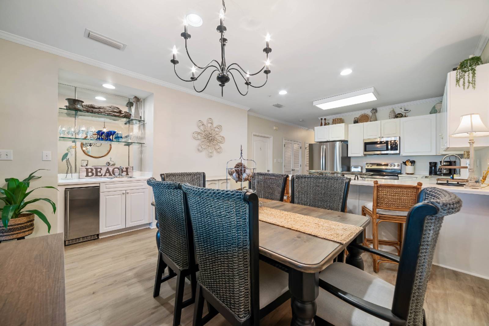 • Fully equipped kitchen with everything you could need in your home away from home; dining table seats six, plus three barstools for additional seating