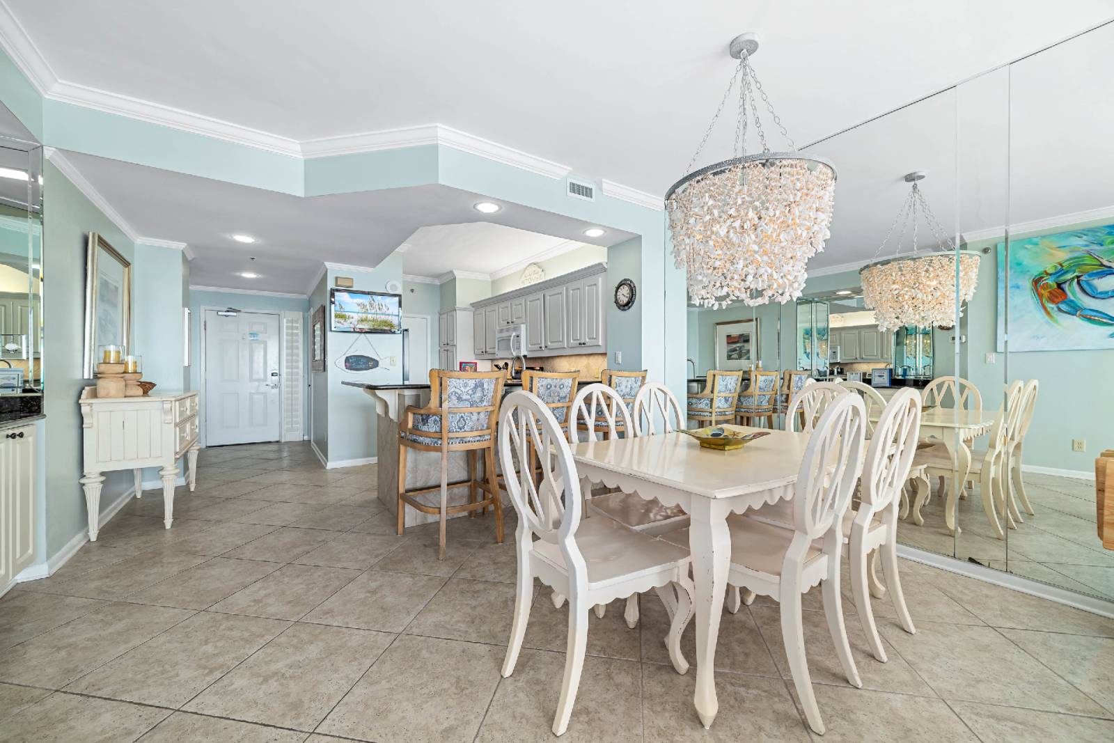 • Fully equipped kitchen with everything needed in your home away from home. Dining area seats six, plus three barstools for additional seating