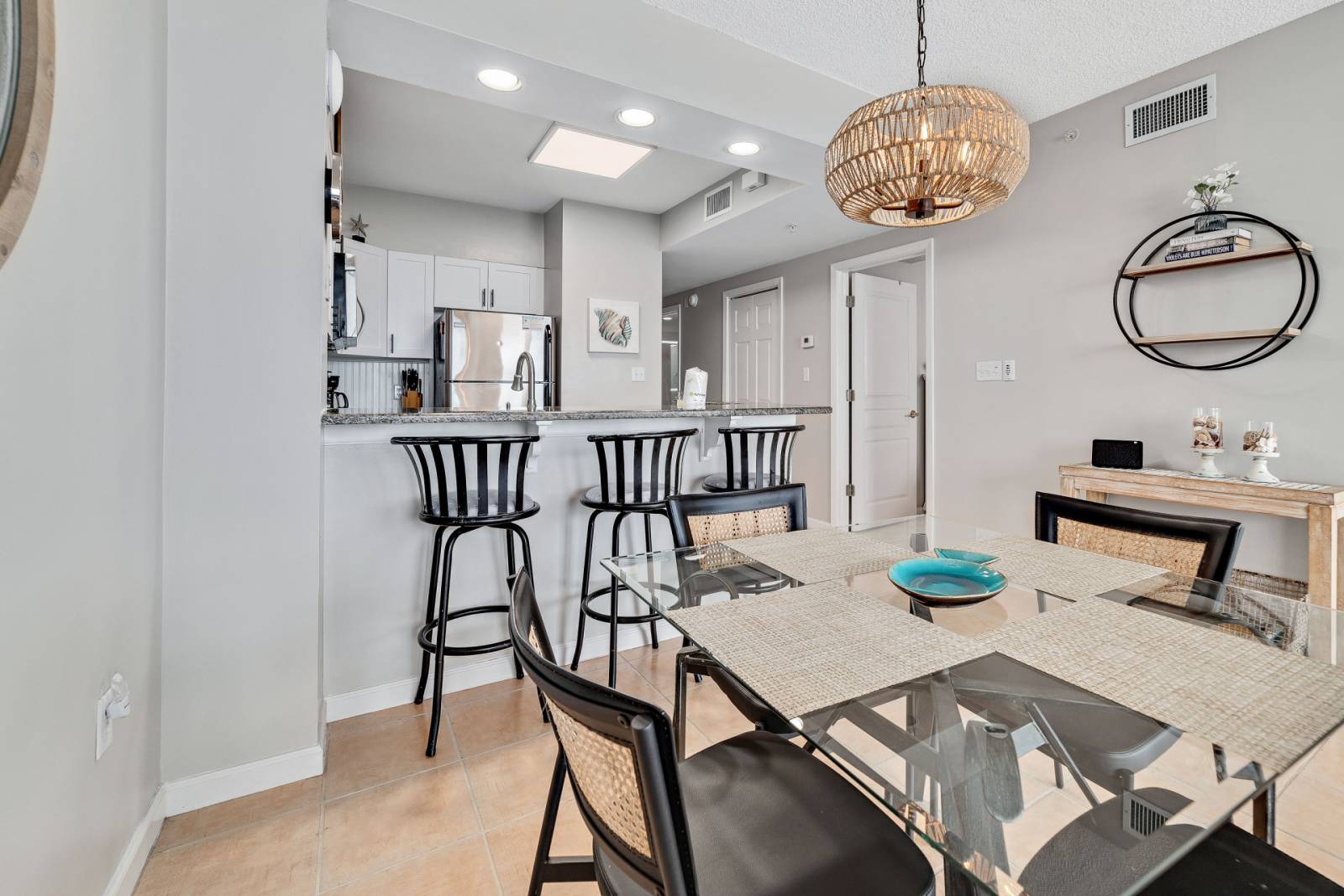 • Fully equipped kitchen with everything that you could need. The dining table seating four and there are three barstools for additional seating.