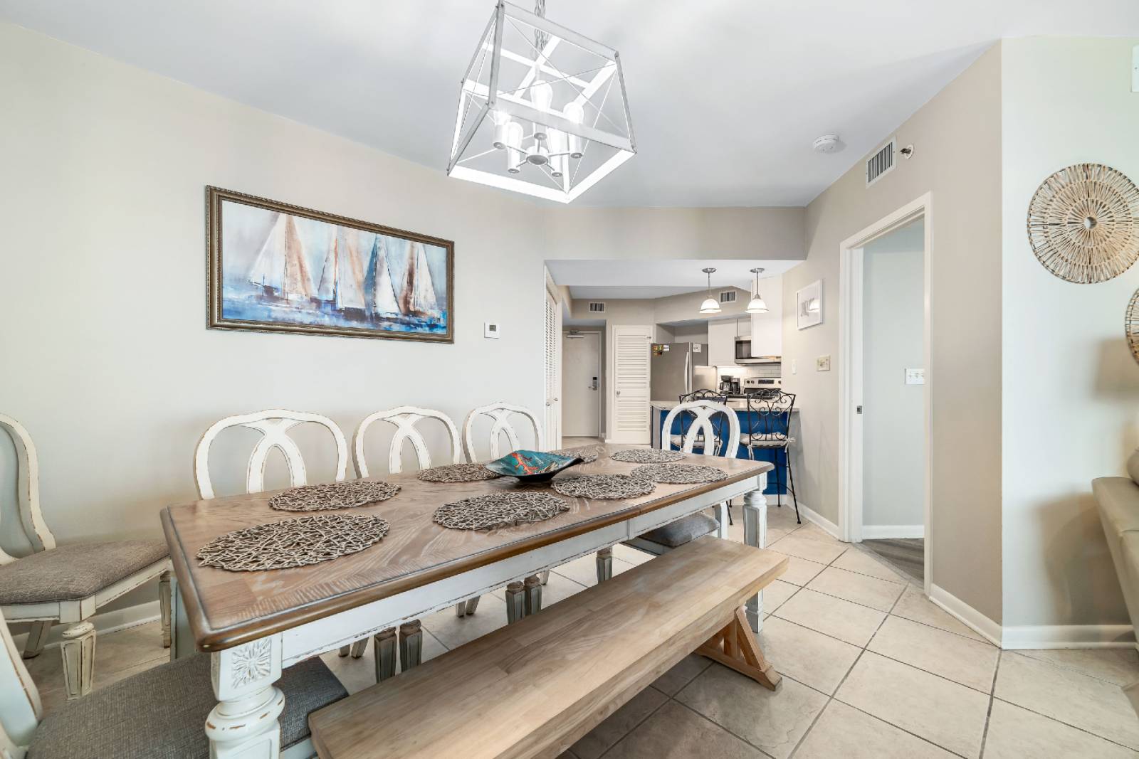 • Fully equipped kitchen with everything needed for a home-away-from-home; dining area seats six with two additional barstools