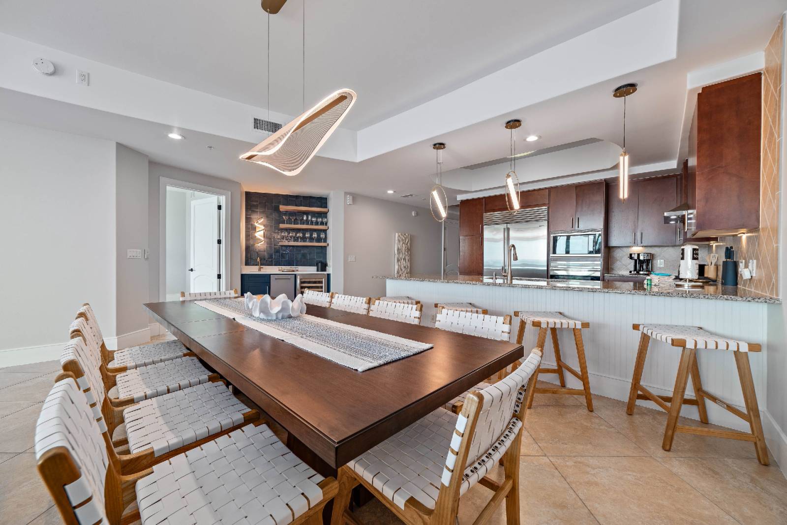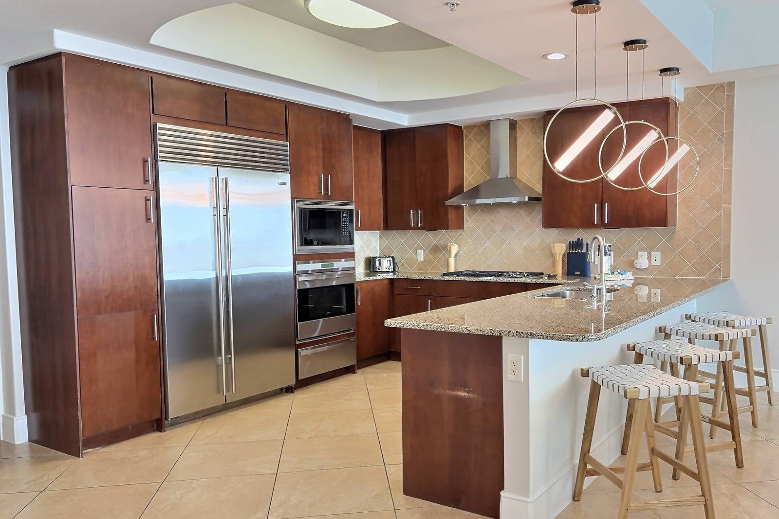 • Unit features a fully equipped kitchen with top-of-the-line appliances. The dining area seats ten, and there are four barstools for additional seating.