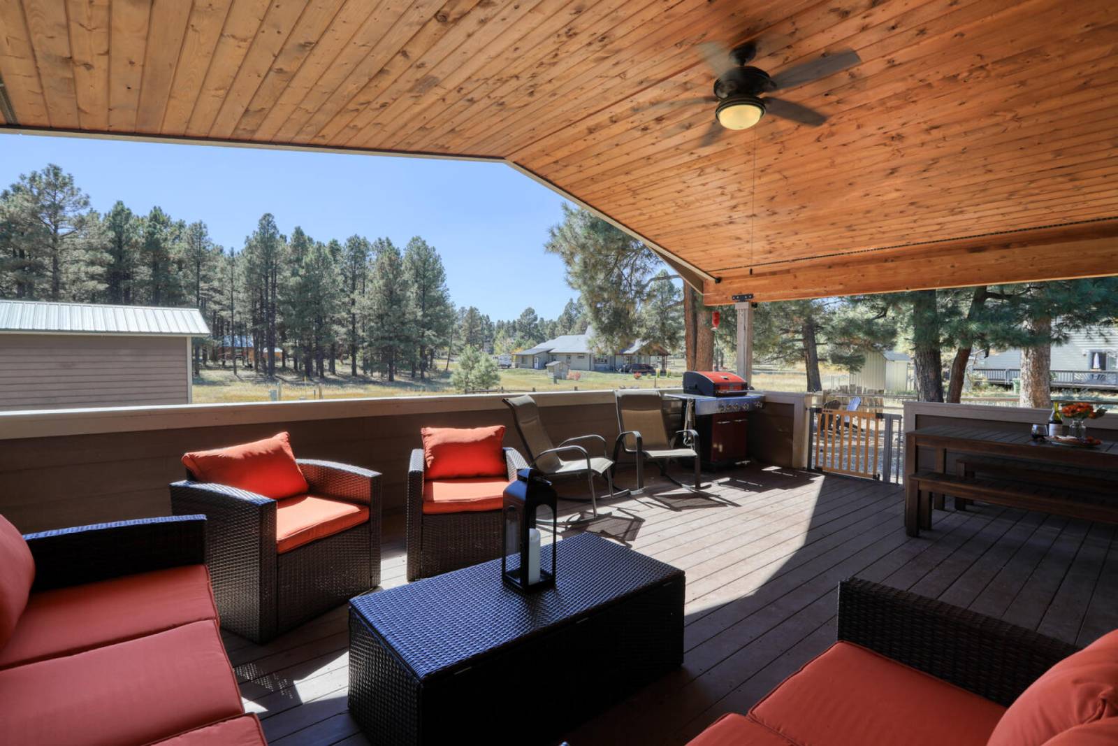 The double doors open to the home’s highlight, a massive covered deck with a sectional lounge, rocking chairs, a picnic table, and a BBQ Grill. There are even shades to roll down when the afternoon sun hits, and there is a great view of the forest, as well as national forest access. Off the porch beneath a trio of Ponderosas is a gas firepit, chairs, and a hammock- perfect for stargazing and lounging!