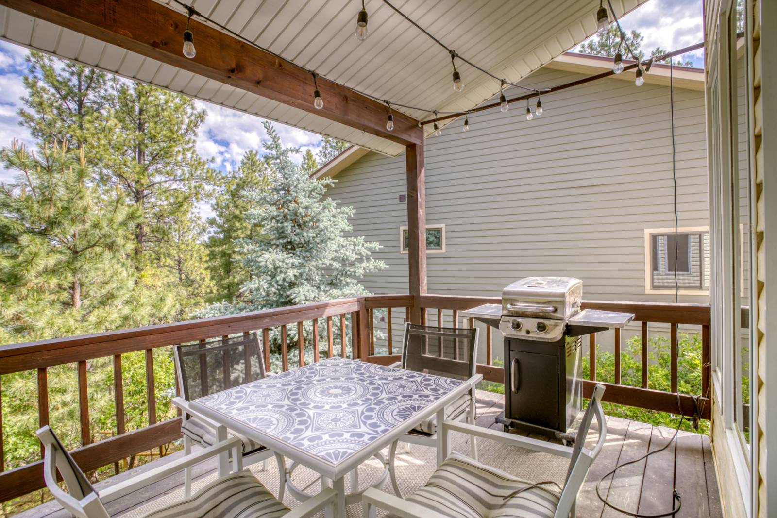 Enjoy outdoor living on the upper deck, adorned with charming string lights that create a magical setting for after-dinner conversations. Downstairs, the walk-out basement opens to a spacious great room and poker/game table, ideal for cozy movie nights or casual entertaining. Follow the gravel path outside and immerse yourself in the peaceful surroundings, where lush trees and blooming flowers create a serene retreat. Love golf? The Pagosa Springs Public Golf Club, featuring 27 holes and breathtaking views, is just down the street.