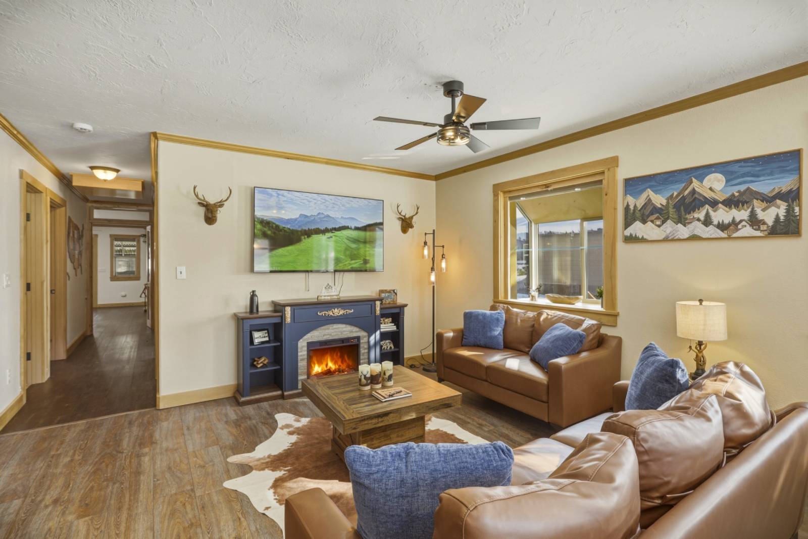 As you enter the home you are greeted by a large open floor plan with the dining room to your right and spacious living room and fully stocked kitchen with a large island and seating straight ahead. Past the living room is the first bedroom with a comfy Queen size bed on your right and a full bathroom on your left. Down the hall is the kids game room followed by the pool table room and covered patio. To the left of the pool table is the primary suite with a King size bed and en suite bathroom. Next to the primary bedroom you'll find the bunk room with two full size beds. To the right is the 4th bedroom with a second queen size bed. Exit the pool table room onto the huge covered patio to relax with your morning coffee or gather with friends and family next to the cozy firepit in the evening. The deck with a the BBQ grill, outdoor dining table and the bubbling hot tub is just a few steps to your left.