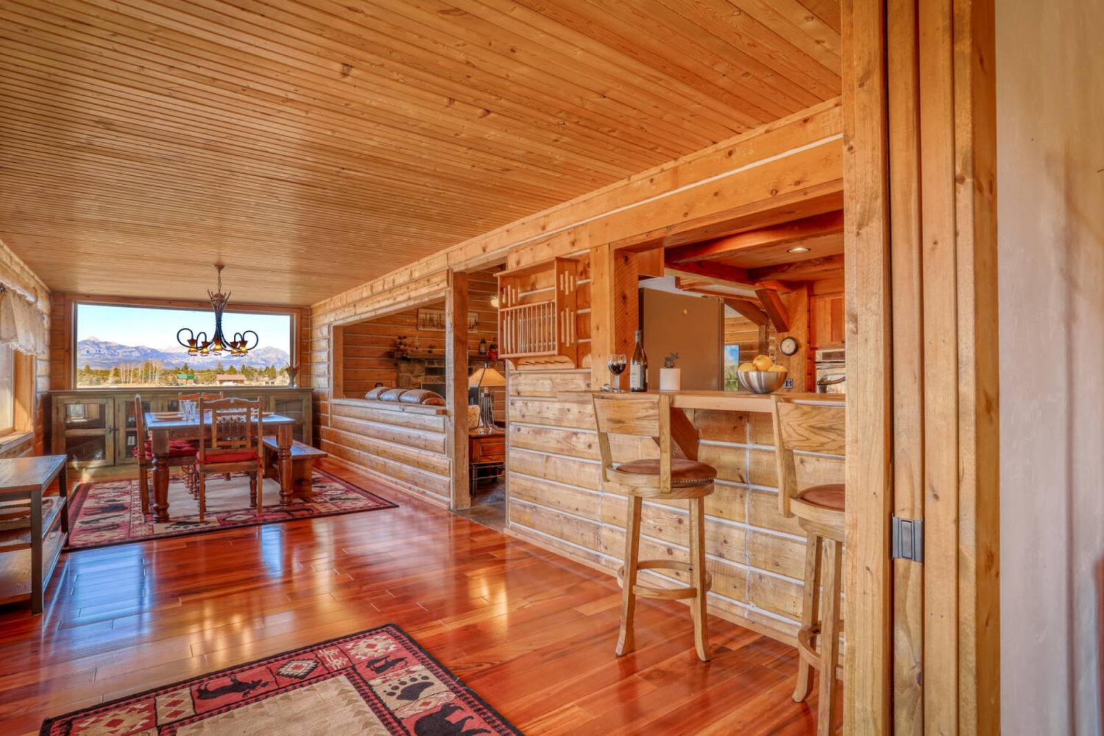 As you pull into the driveway, you are greeted by a gorgeously landscaped yard surrounding the honey-toned cabin. The front entry is spacious and conveniently offers shoe pads, hooks, and bins to place all of your gear in and stay organized. To the left opens to the dining room with rich wood floors, an outstanding view of the outdoors, and a stunning custom chandelier. To the right flows to the stainless steel kitchen ample utensils and supplies for whipping up meals, a convenient deep sink, and charming wooden island and so much more. Directly in front of the kitchen is the spacious, high-ceiling living room with cozy seating, a wood-burning fireplace, more views, and a massive, flat-screen smart TV with streaming options. Moving forward is the foyer for the other entry with wraparound deck access, a multitude of games, and storage.