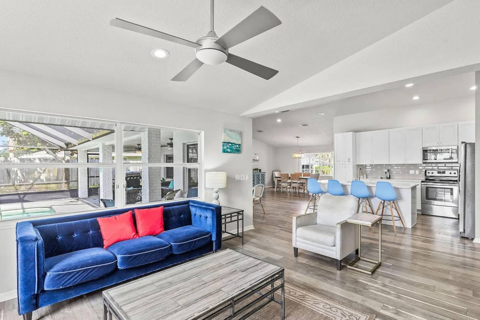 Inside, the home is open, airy, and thoughtfully designed for comfort. Smart TVs are located in every bedroom, the living room, and even the outdoor patio, making it easy to unwind with your favorite shows—whether you’re cooling off indoors or relaxing under the stars.