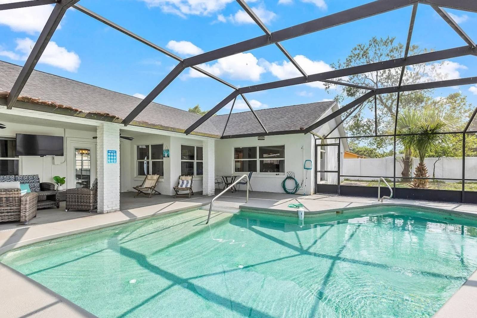 Spend your days splashing into the sparkling private pool, featuring a gentle ramp entry for easy access, then lounge poolside with a cold drink as palm fronds sway overhead. Fire up the BBQ grill, settle into the outdoor seating, and enjoy long afternoons filled with laughter and the scent of something delicious on the grill.