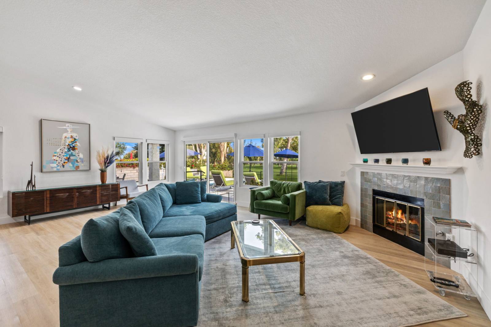 The beautiful backyard wraps around the home to provide an amazing experience. The side yard off the kitchen features a 3 burner BBQ and outdoor dining for four. Around the corner you are welcomed by the pebble tech pool and spa, a large fire feature, six person sectional seating and a couple of chaise lounges. Perfect backyard to relax and enjoy the sunshine! The backyard provides eastern and southern views of the golf course and mountains.