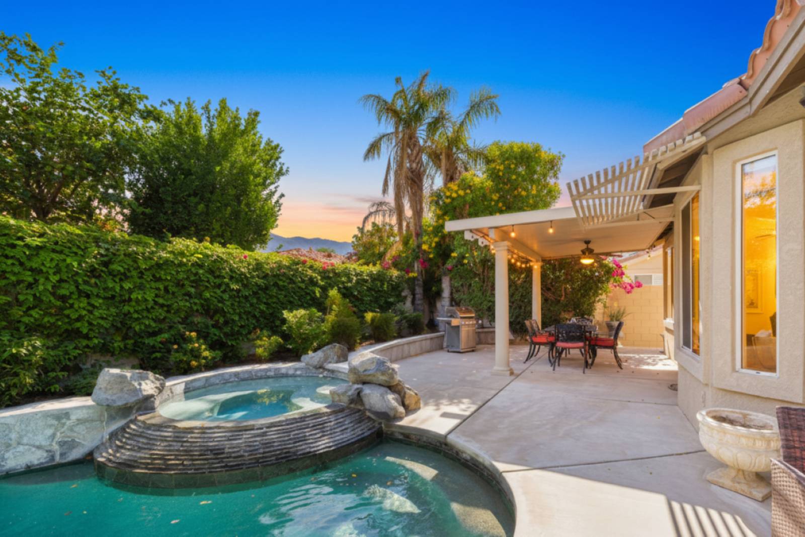 The private yard faces south and provides ample sun throughout the year. Catch some sun and relax on the chaise lounges, or enjoy lunch or dinner in the shade under the patio cover. The pool and spa are great amenities to use while on vacation! At night, relax and watch the sunsets while sitting next to the fire table. The property features a 4-burner gas BBQ grill.