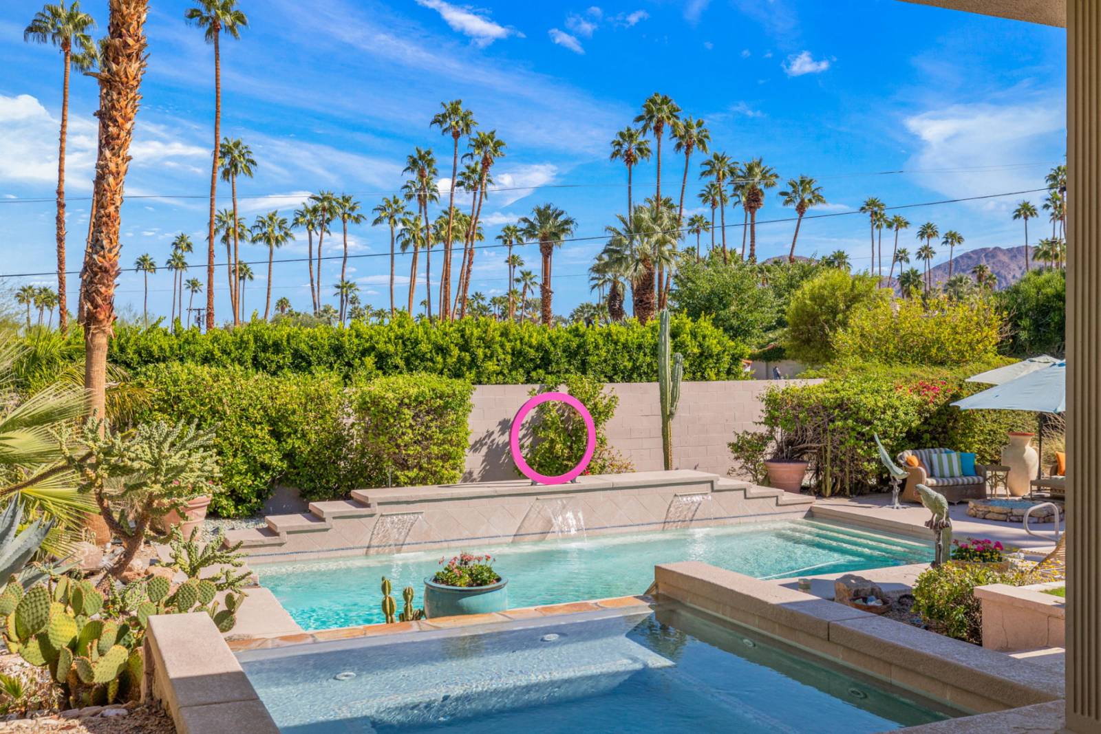 Exit through the living room, kitchen, or master bedroom to reach the covered patio, which offers a stunning view of the Coachella Valley and the pool area. The patio features a dining table for six, perfect for outdoor meals. The property also includes a 5-burner grill and a three-burner Blackstone griddle, making it an excellent space for grilling and socializing with loved ones. Just steps from the patio, a beautiful pool invites you to relax, with a seating area to soak up the sun. On cooler nights, unwind in the spa or gather around the glass firepit by the pool for a cozy, relaxing evening under the stars.