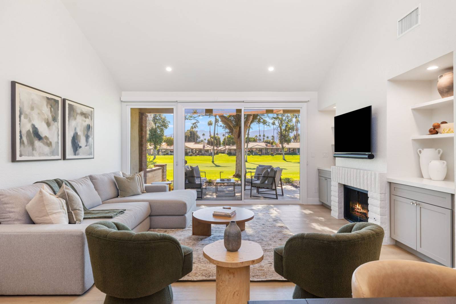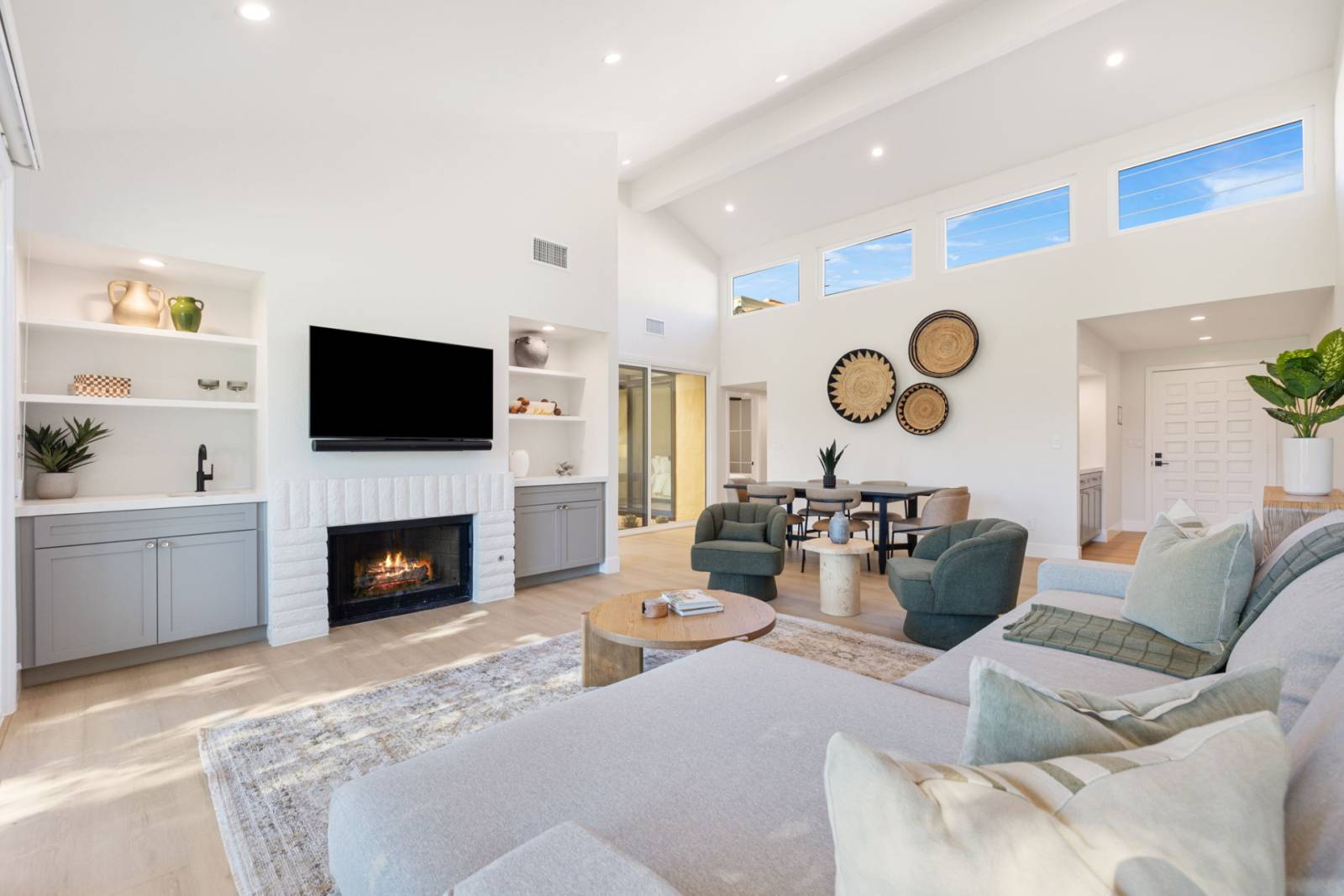 The interior is open and airy, with vaulted ceilings and a bright white palette that reflects the natural light throughout the living and dining areas. The living room centers around a fireplace and built-ins, creating a welcoming space to gather. A sofa with chaise and two side chairs are arranged for conversation or movie nights, with a TV positioned for easy viewing. Sliding glass doors connect the living space directly to the patio, blending indoor and outdoor living.
