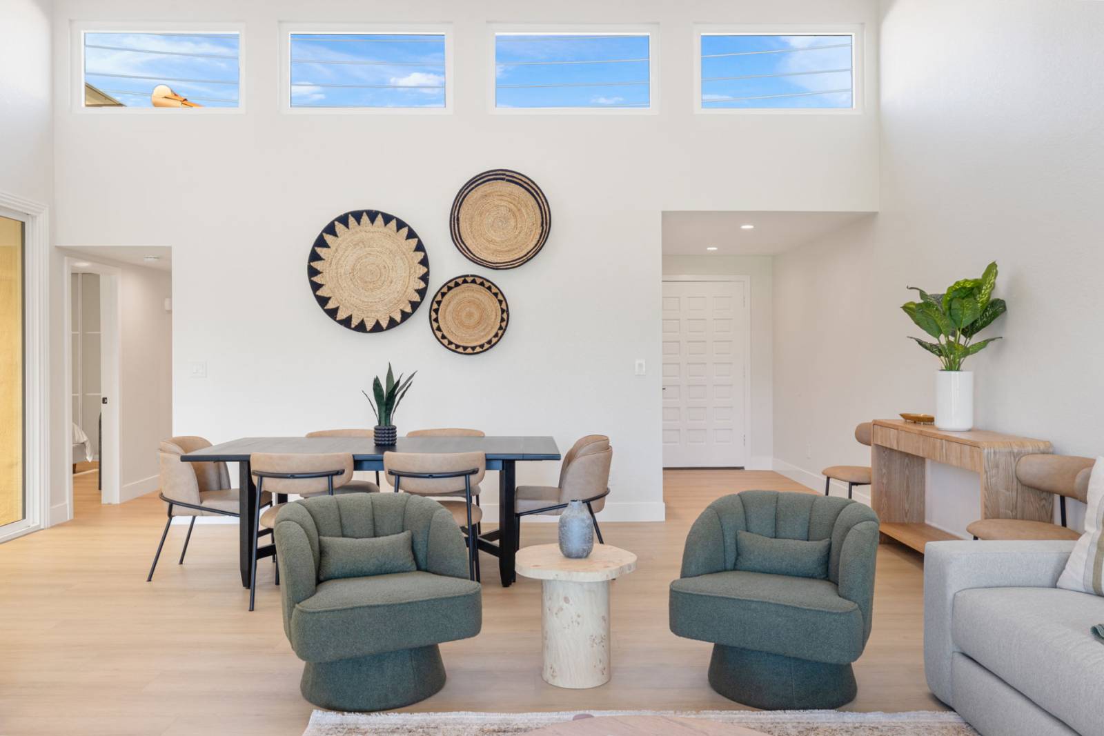 The dining area flows seamlessly from the living room, anchored by a table that comfortably seats six—ideal for shared meals or lingering evenings. Nearby, a wet bar adds a touch of convenience and makes entertaining effortless.