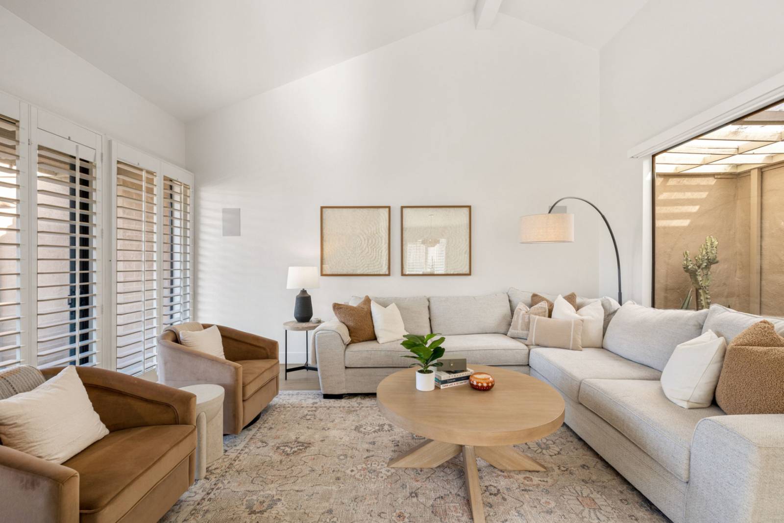 The interior opens into a calm, cohesive living space defined by neutral tones and an easy sense of flow between the living, dining, and kitchen areas. A sectional sofa and side chair are arranged to face the fireplace and TV, creating a comfortable gathering area that feels polished without being formal. Sliding glass doors draw the eye outward to the patio and golf course beyond, keeping the landscape present throughout the day, while a wet bar tucked nearby adds a subtle entertaining element without dominating the room.