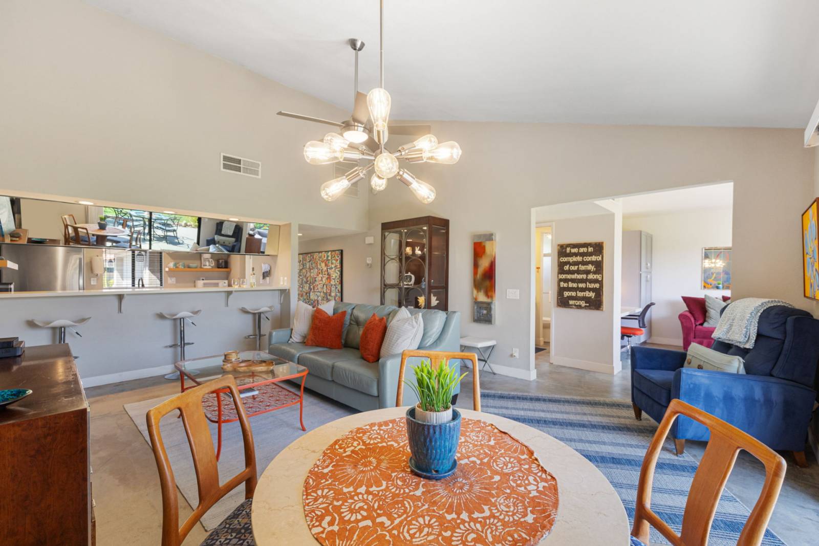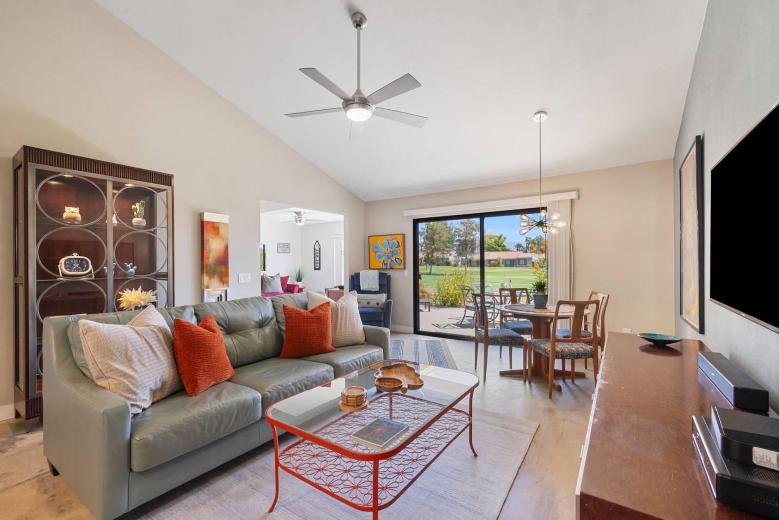 This beautifully updated and designed condo offers both comfort and style. The living room features a 55-inch Smart TV, a cozy sofa, and a dining table that seats four. Connected to the living space, the kitchen includes a breakfast bar with upgraded appliances, providing everything you need for meal preparation. Adjacent to the living room is a den/office that offers a spacious work area and a guest bath. You can enjoy stunning views of the golf course from both the living room and the den/office space. The unit features an air conditioning garage for two vehicles, and a full-size washer and dryer.