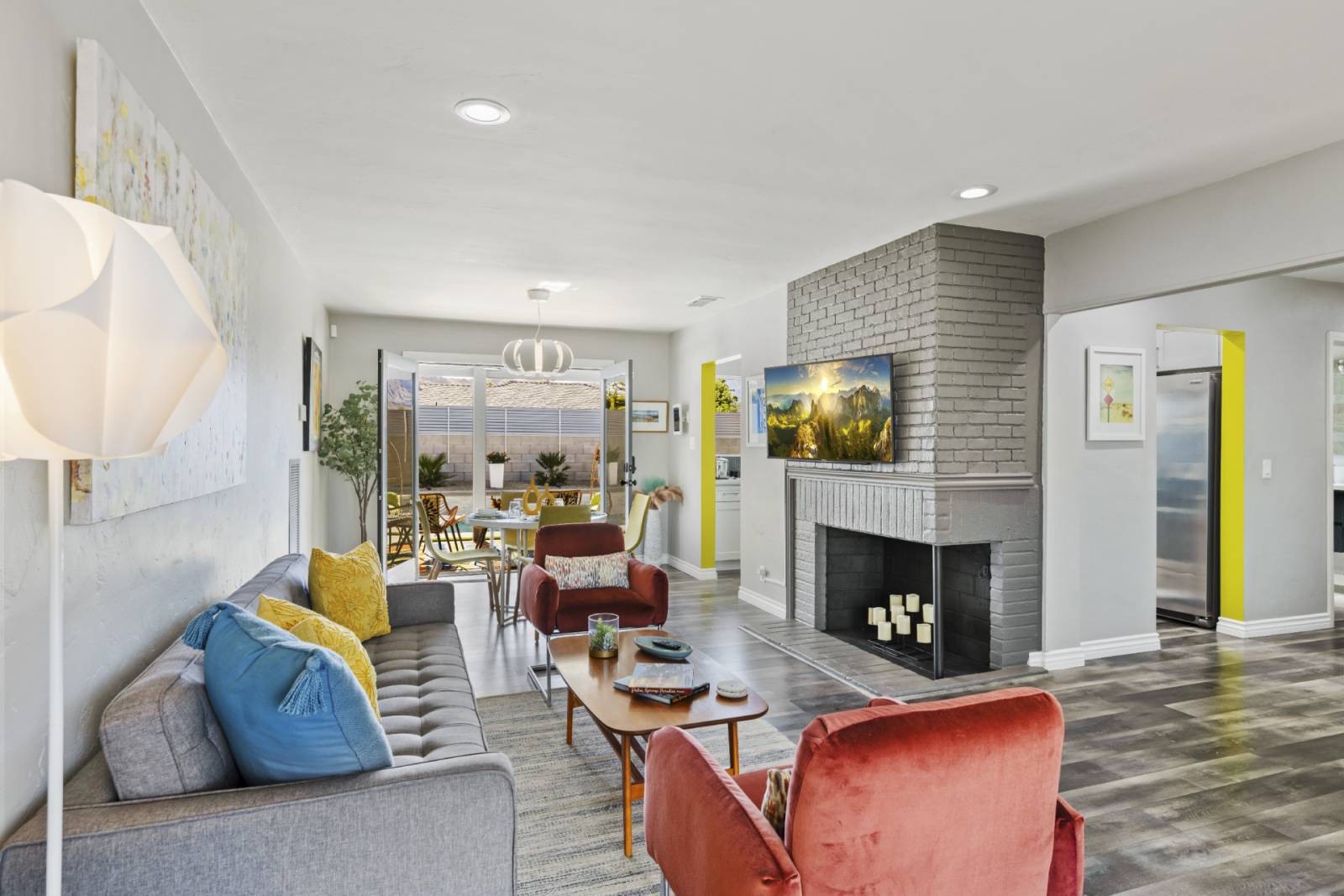 On this main and only level, the floorplan includes the living room with fireplace and seating, a dining area oriented toward the courtyard, a well-equipped kitchen with stainless steel appliances and counter space for gathering, a designated area for working remotely, a full laundry setup, central air conditioning to keep the interior cool on warm Palm Springs afternoons, and easy access to the pool beyond sliding glass doors.