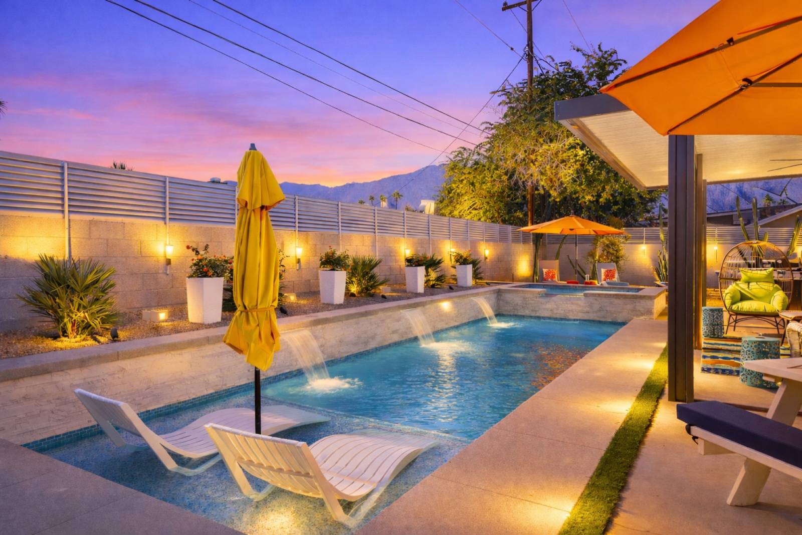 The outdoor space unfolds like a private compound, where the newly installed pool and spa sit at its heart, waiting to be enjoyed below the southern California sun or under the warm glow of desert stars.
