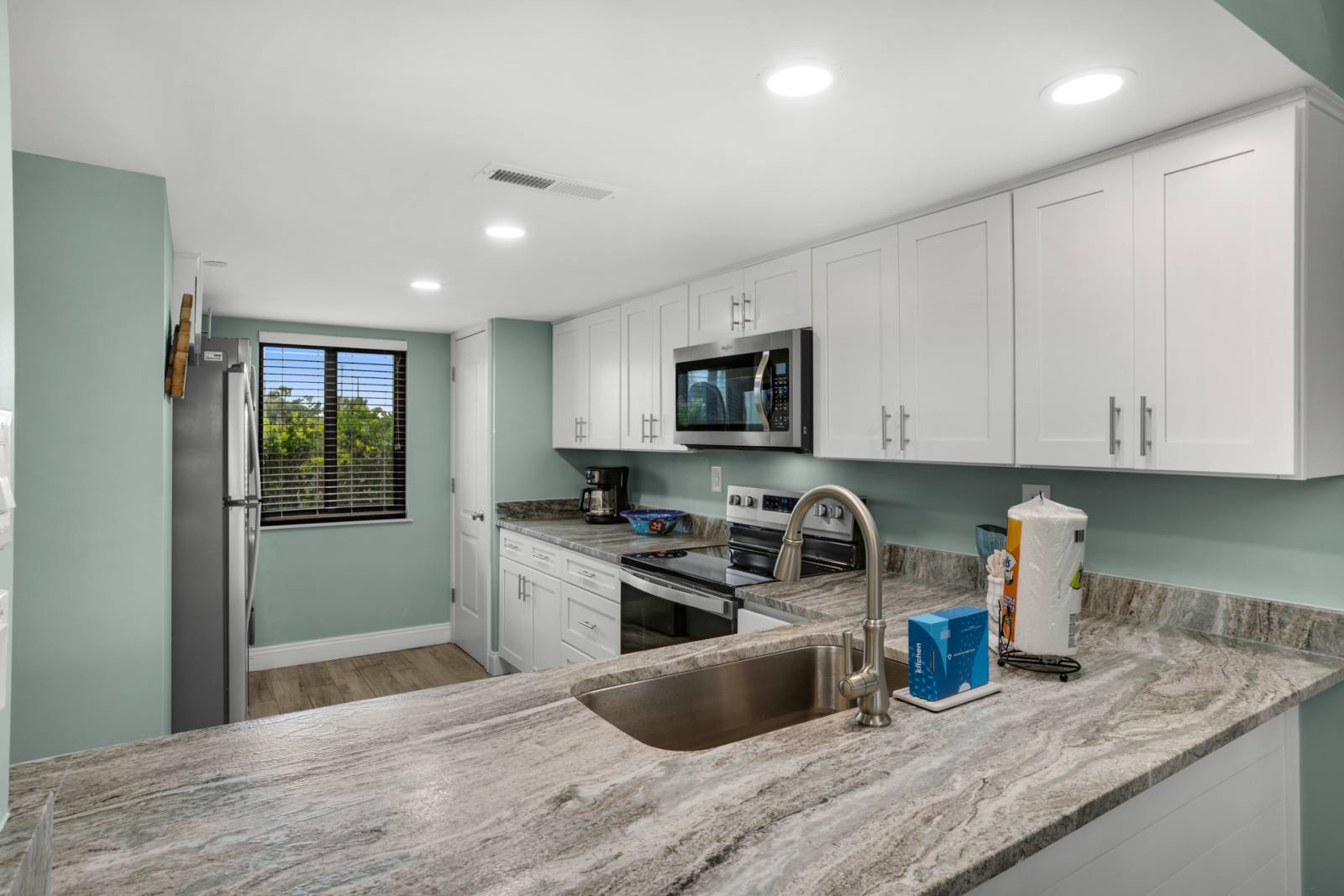 ✔ Kitchen: This stunning, newly renovated kitchen is fully equipped to prepare all your favorite meals. There is seating at the bar for two, as well as a dining table with seating for six.