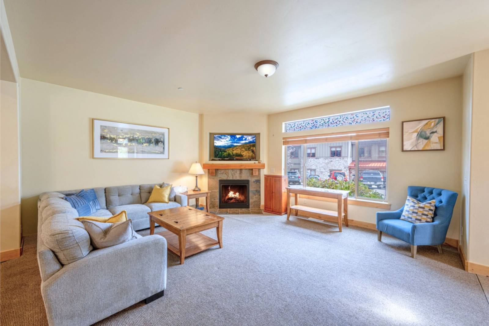 The main living space features comfortable seating, a gas fireplace, and multiple TVs for group entertainment.