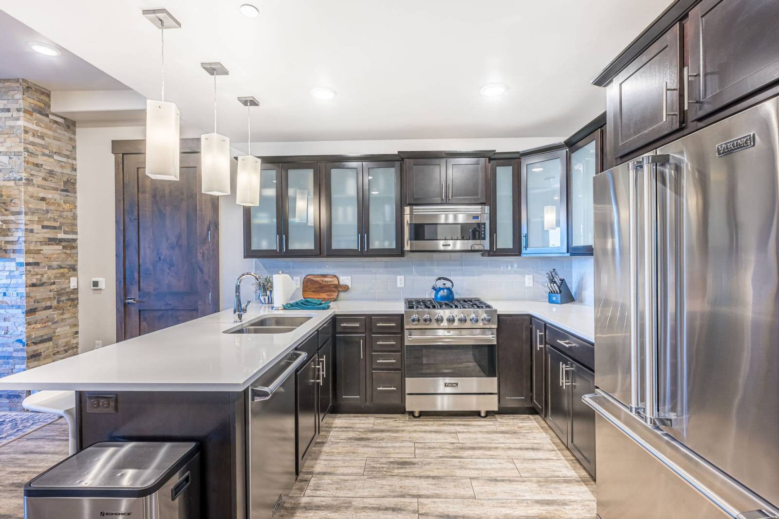 The fully equipped kitchen includes Viking appliances, granite countertops, and a breakfast bar with seating for two. The dining table seats six comfortably for shared meals and evening gatherings.