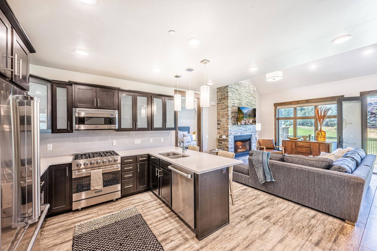 The chef-style kitchen features Viking appliances, quartz countertops, and a breakfast bar, making it easy to cook and entertain. The adjacent dining area flows naturally into the living space for relaxed, communal meals.