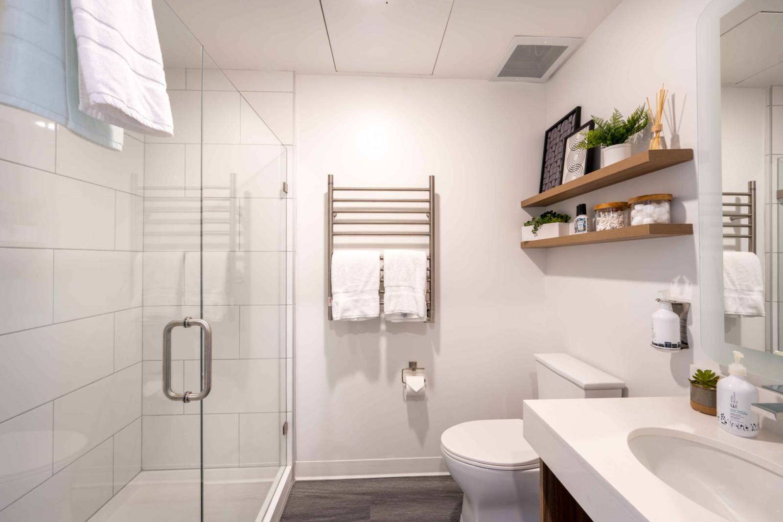 Bathroom: The full shared bathroom is well-appointed with quartz counters, a heated towel rack, and a spacious shower.