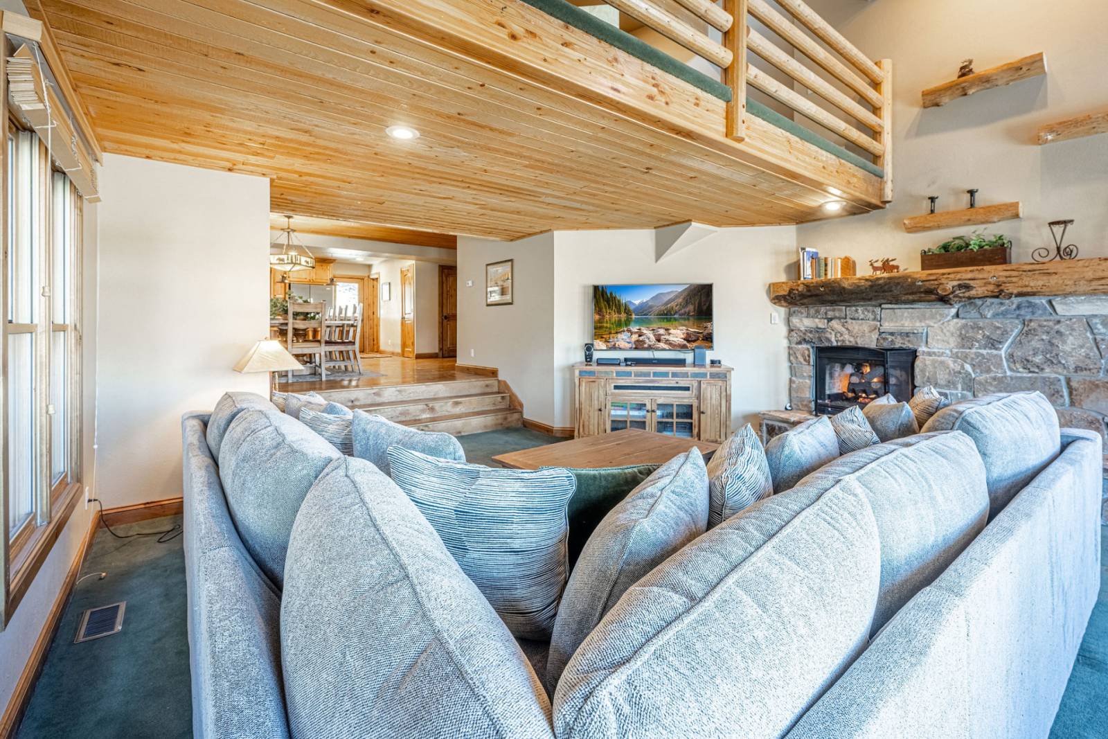 • Open living area with a gas fireplace, new comfortable sofas, and an HDTV