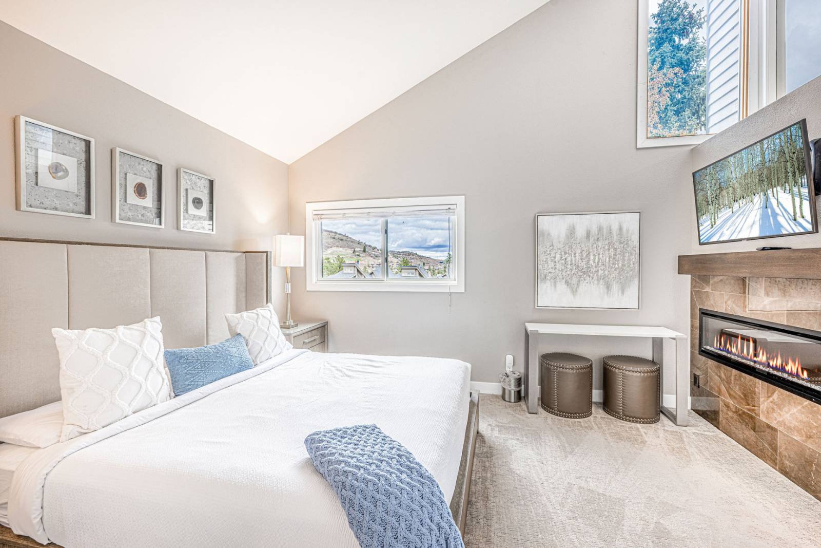 • Primary Suite (Top Floor): California King, fireplace, vaulted ceilings, Smart HDTV, spa-like ensuite with soaking tub + walk-in shower